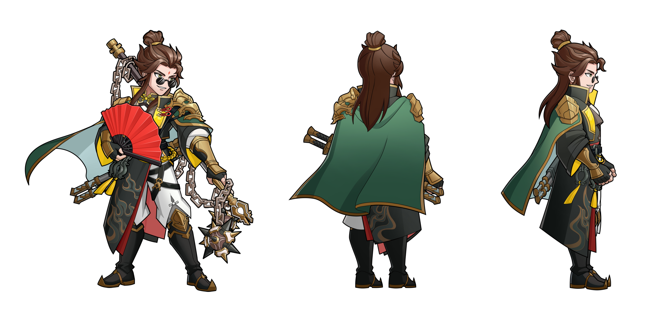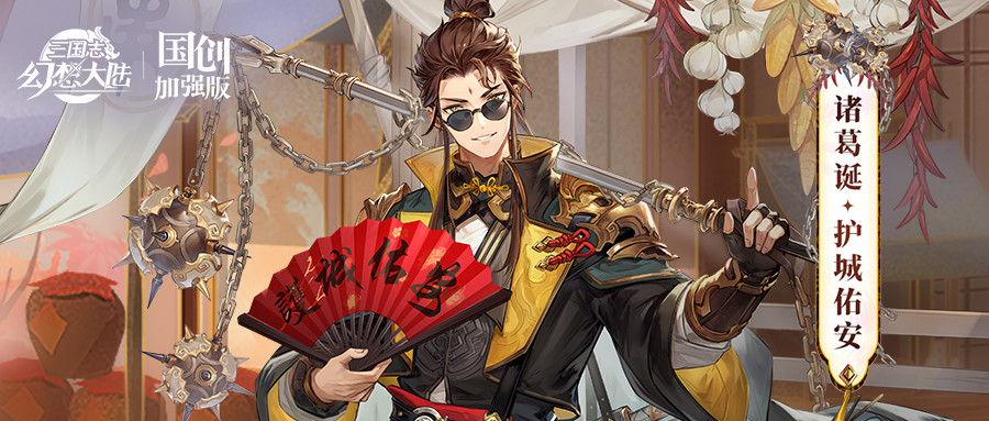 皮肤以黑色为主色调,点缀金色和绿色,以市井生活中屯卫市镇的巡察人士为主题,设计成方便活动的窄袖锦袍,搭配短款高领夹克,洒落干练。诸葛诞左手持特制的机关锤,右手展开正红色折扇,上书“护城佑安”,墨镜一推,更显他张扬狂傲。