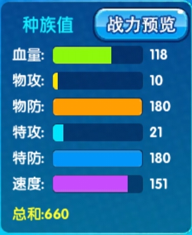 种族值分析:血量118,物防180,特防180,速度151。作为一个骚扰型辅助,双防也是非常的出色,同时速度也达到了151,相对于其他一些输出宝可梦的速度快。