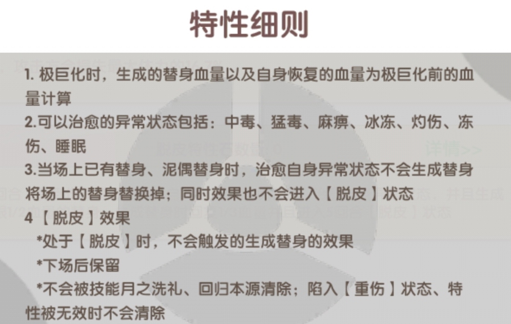 ·接替队友出场的回合,受到伤害减少25%;自身陷入异常状态时,治愈自身异常状态,并生成一个自身血量上限1/2血量的替身,生成替身时1/3血量并且进入5回合[脱皮]状态