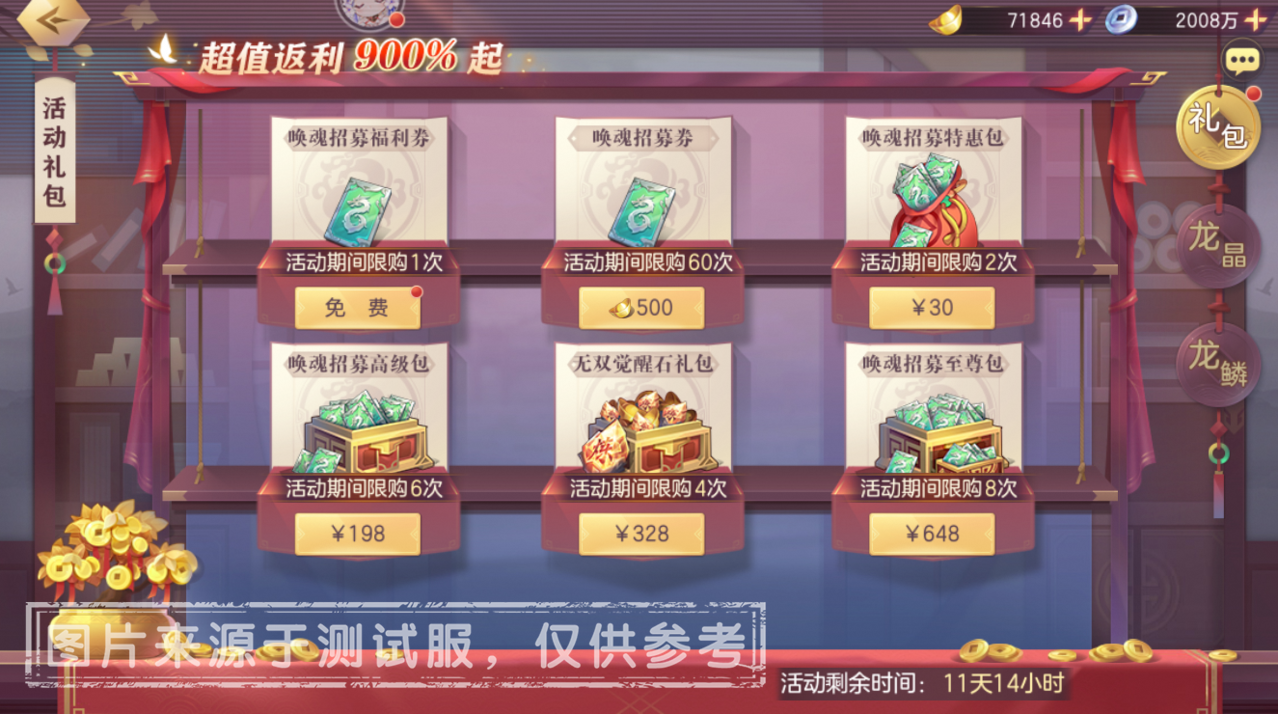 活动期间,限时上线唤魂特惠礼包,超值返利900%起!