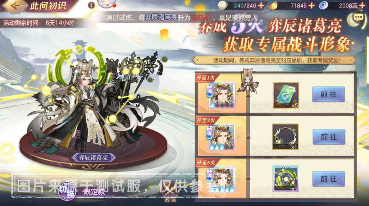 在【此间初识】模块中,本次活动将会开放「弈辰诸葛亮-限定款战斗形象」,并可在该模块中进行试玩,该活动奖励可在「弈辰诸葛亮」的觉醒等级培养至目标等级时获取!