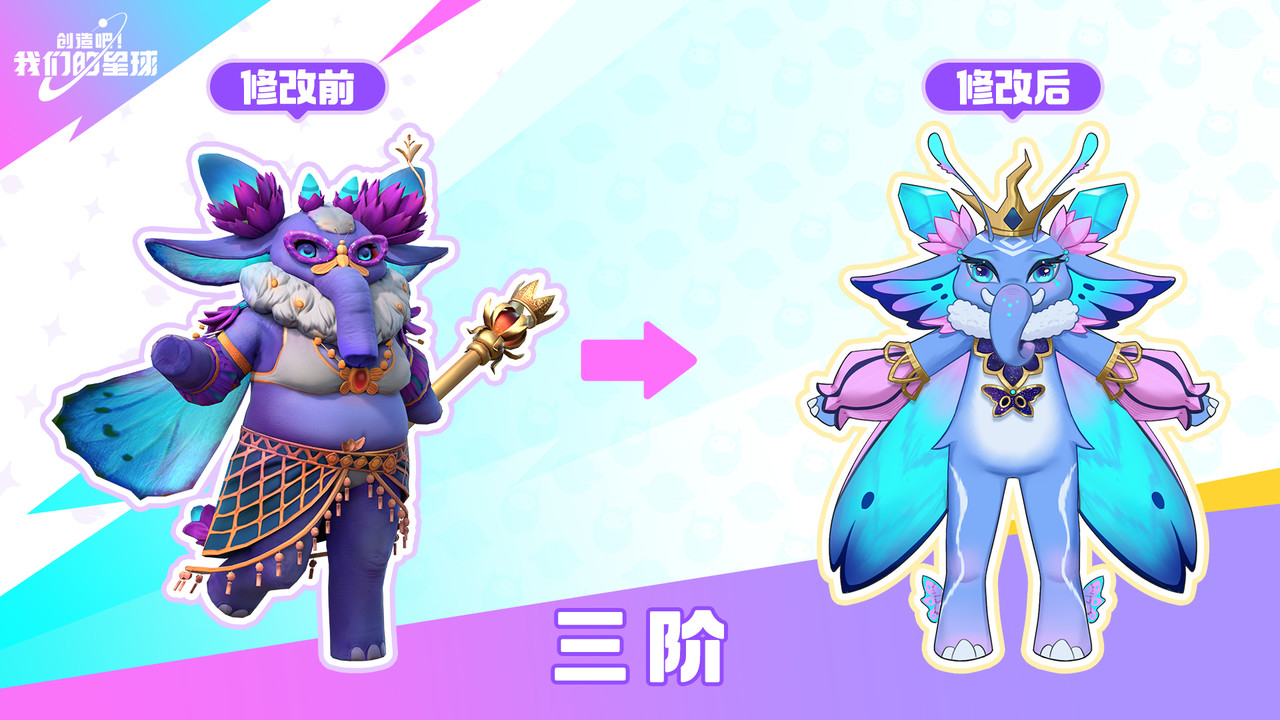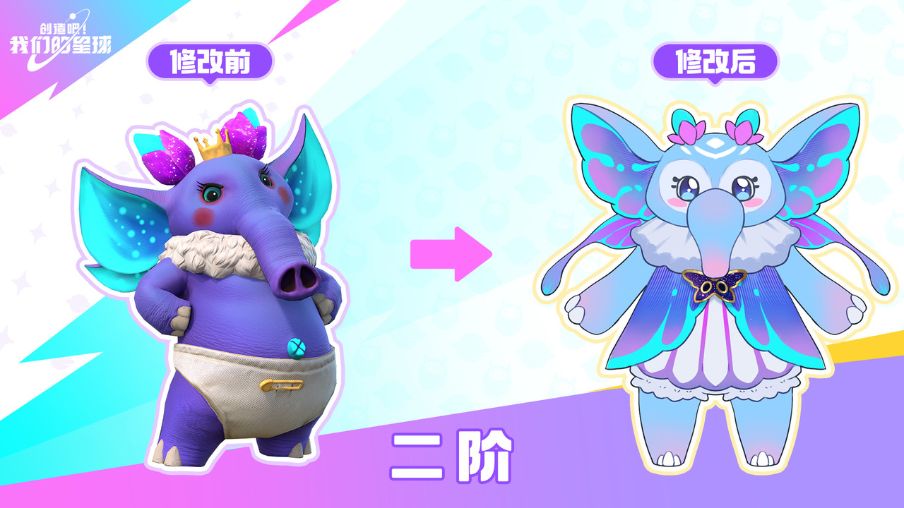 调整思路:新版象飞飞啾在形象上更加卡通化,会更符合游戏轻松活泼的基调。整体轮廓采用流线型设计,以体现蝴蝶般美丽轻盈的特点,减少了之前复杂的金属装饰,使其更加统一和谐。