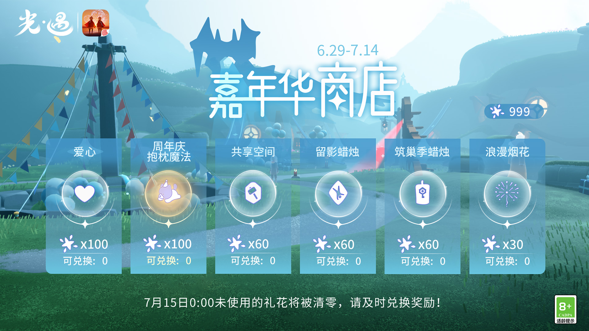 兑换爱心、周年庆抱枕试用魔法、共享空间、留影蜡烛、季节蜡烛和浪漫烟花