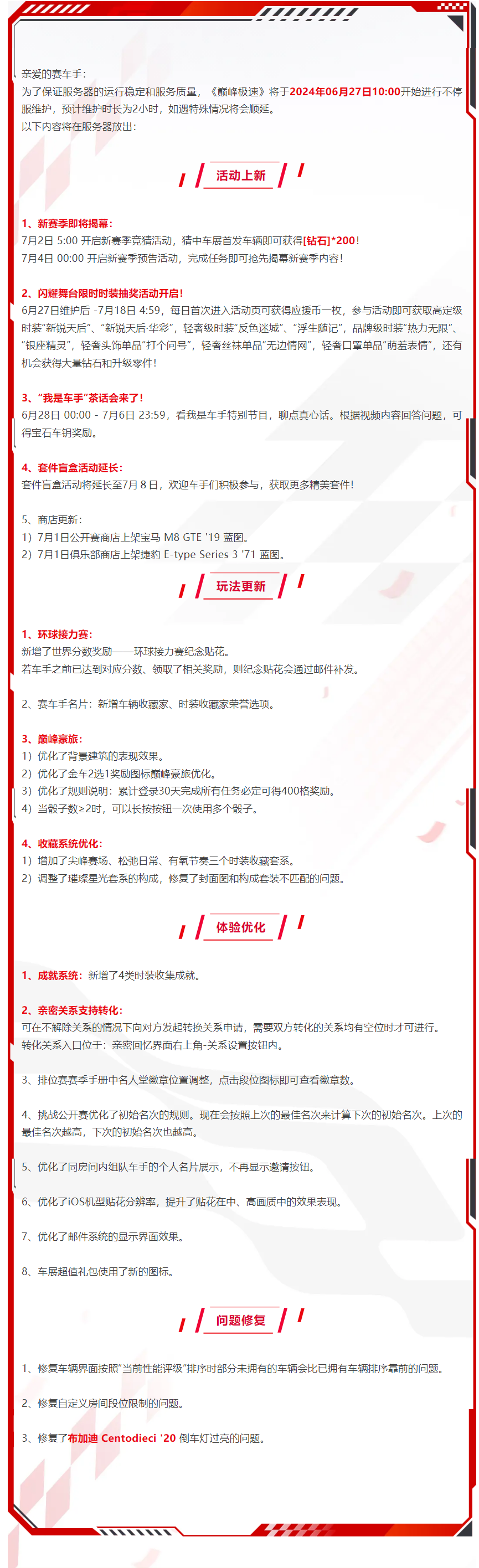 【维护公告】新赛季预告来袭,闪耀舞台时装抽奖限时开启!光环小G发布于 2024-06-26关注 庆典签到火热进行中,签到7天即可获得价值【10连抽】钻石;巅峰豪旅活动现已开启,完成任务累计获得超过【100抽】奖励;盛夏车手季,我们一起浪!