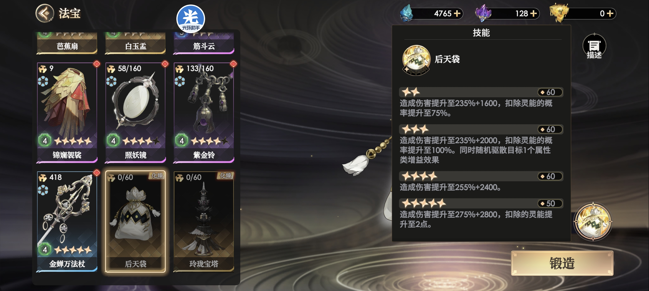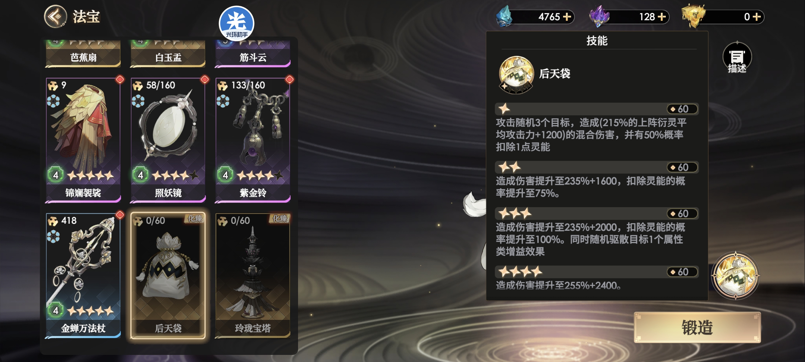 化臻级法宝-后天袋,主要功能为对随机3人造成伤害同时减灵能,高星附带驱散效果