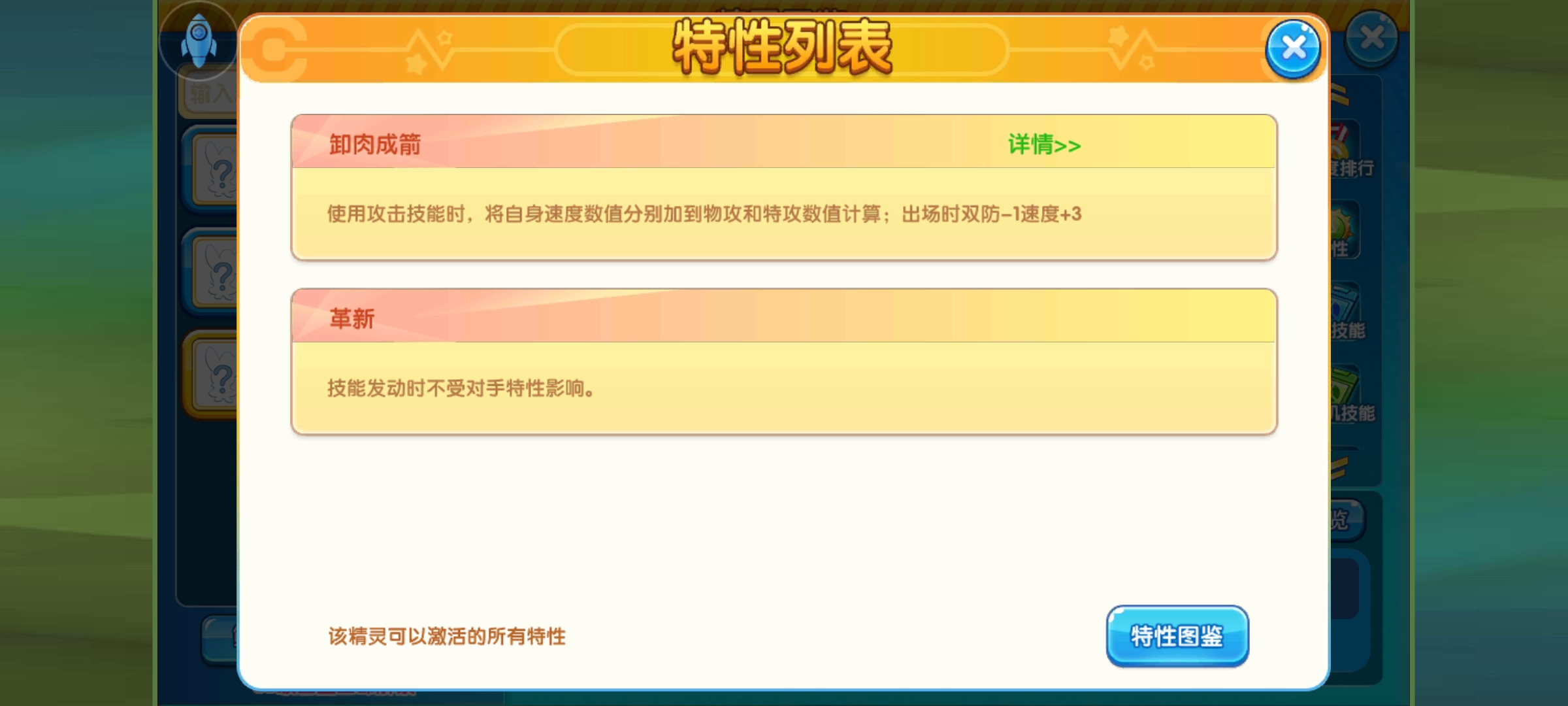 特性有2个,不过当然开专属特性卸肉成箭了,效果是使用攻击技能时,将自身速度数值分别加到物攻和特攻数值计算,出场时双防-1速度+3,参与计算的物攻特攻速度为最终数值,数值向下取整,可以看出就是让它更脆更暴力。