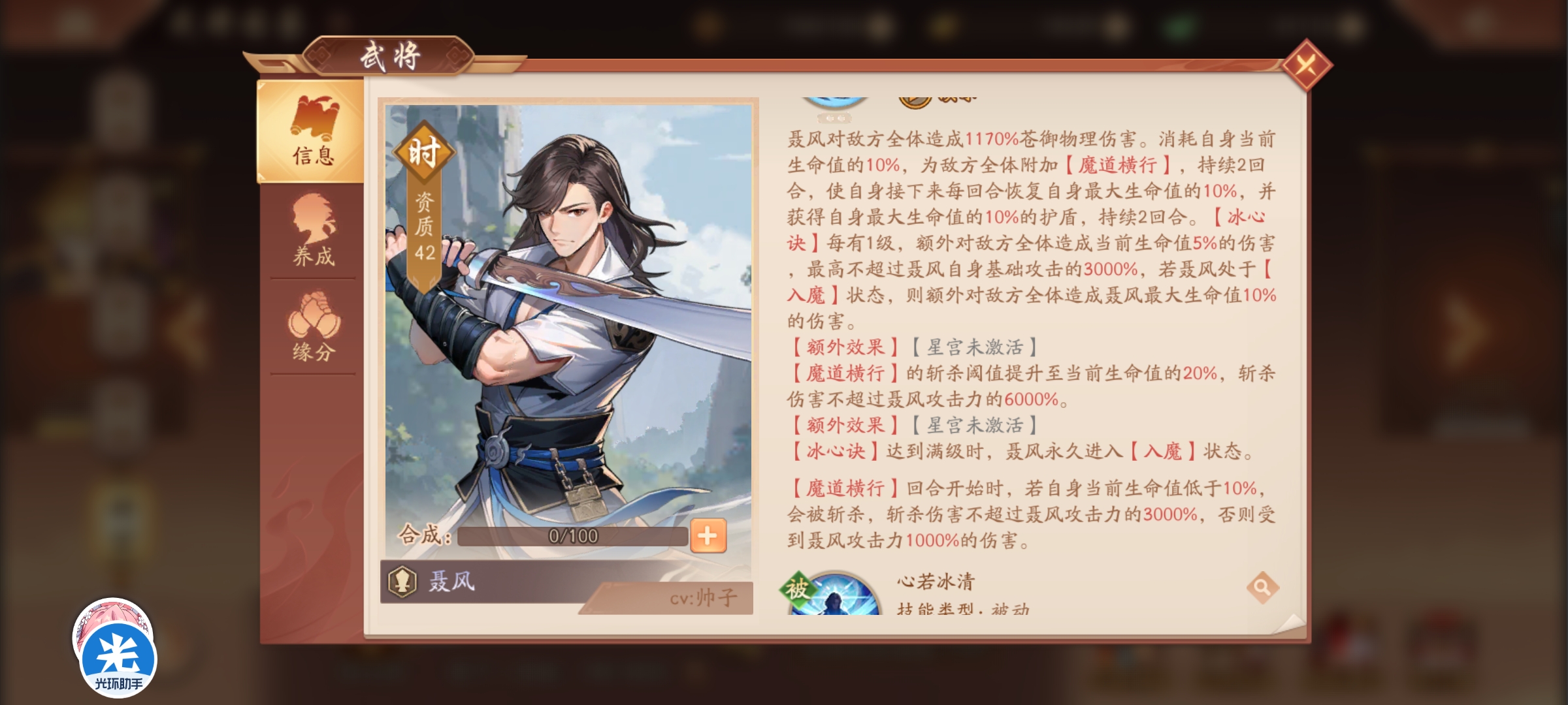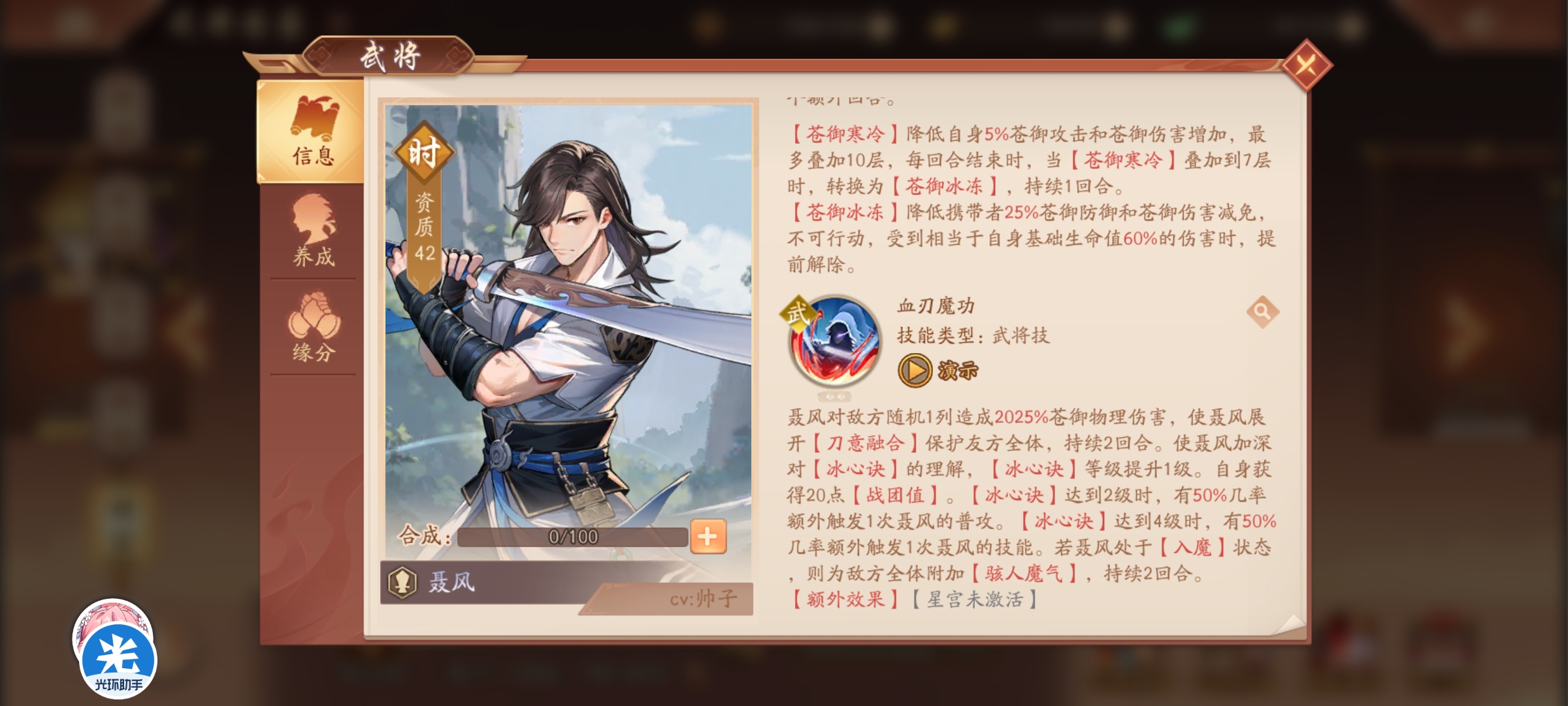 聂风对敌随机一列造成苍御物理伤害,刀意融合保护友方全体两回合 冰心诀升1级