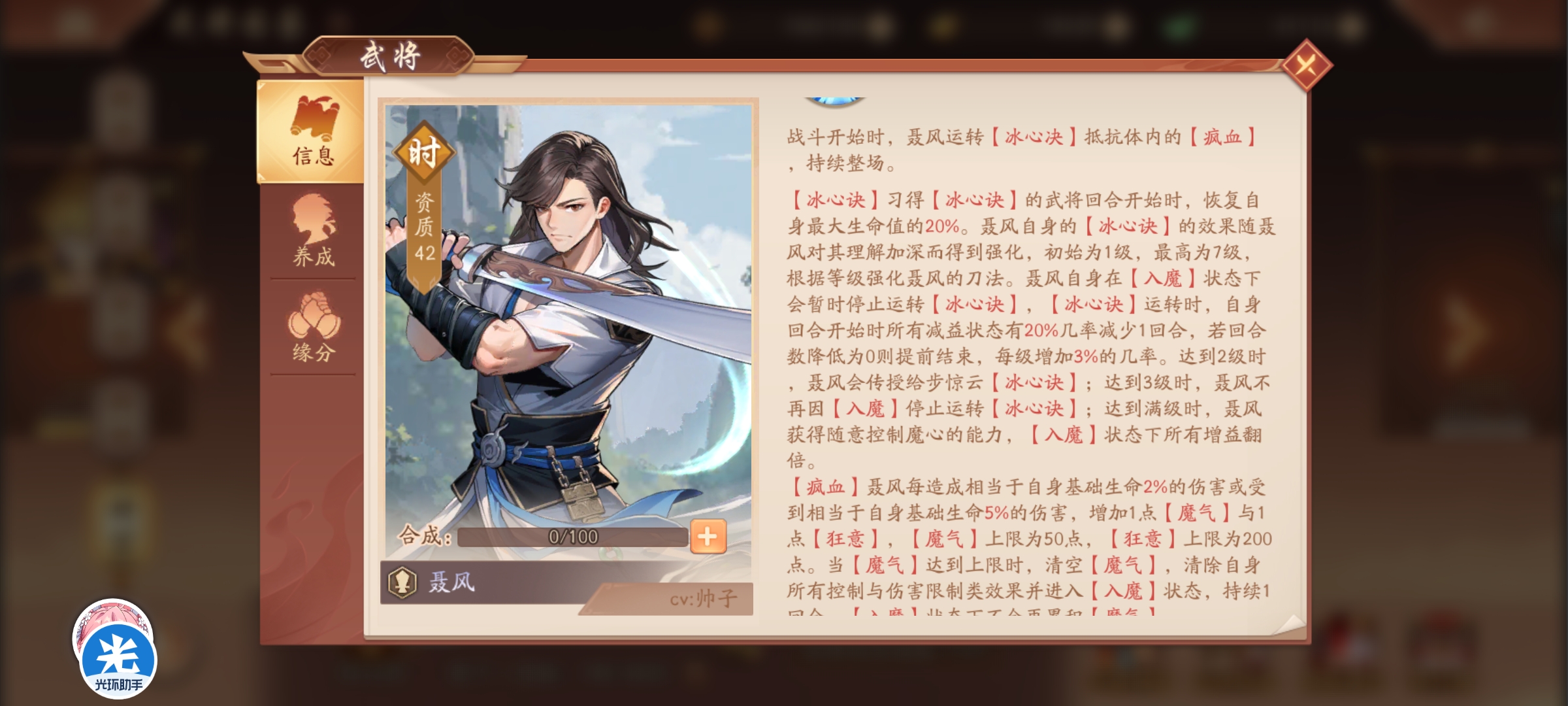 自身每回合恢复10%最大生命值持续2回合,冰心诀每级额外对敌全体造成当前生命5%的伤害 若聂风处于入魔 额外对敌全体造成聂风最大生命值10%伤害