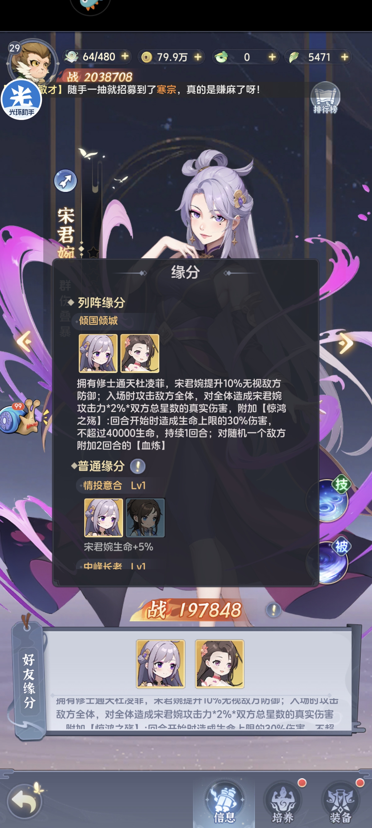 阵容中除了少年白小纯因为前期送超多碎片星级很高所以固定上阵外,其他5人均选择女性上阵。通天杜凌菲和宋婉君作为阵容中的输出位,在开场时会自动施放组合技攻击,杜凌菲的大招拥有连斩机制,只要造成击杀就能一直继续施放大招。宋婉君的大招能为目标附加【血炼】状态,受到暴击时附加真伤。她的神1天赋能让我方攻击血炼目标时增加暴击率,女性翻倍,所以非常适合女团阵容使用。