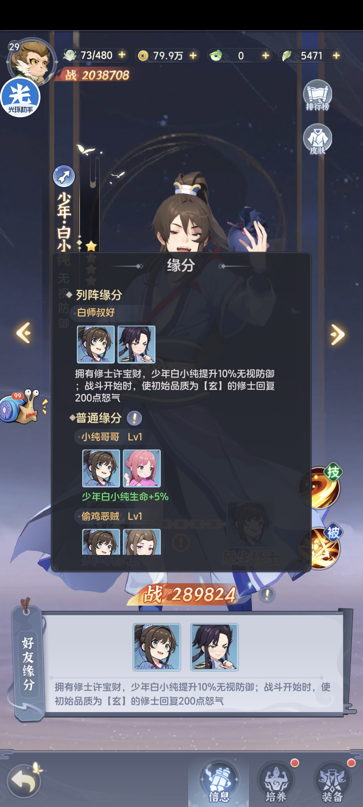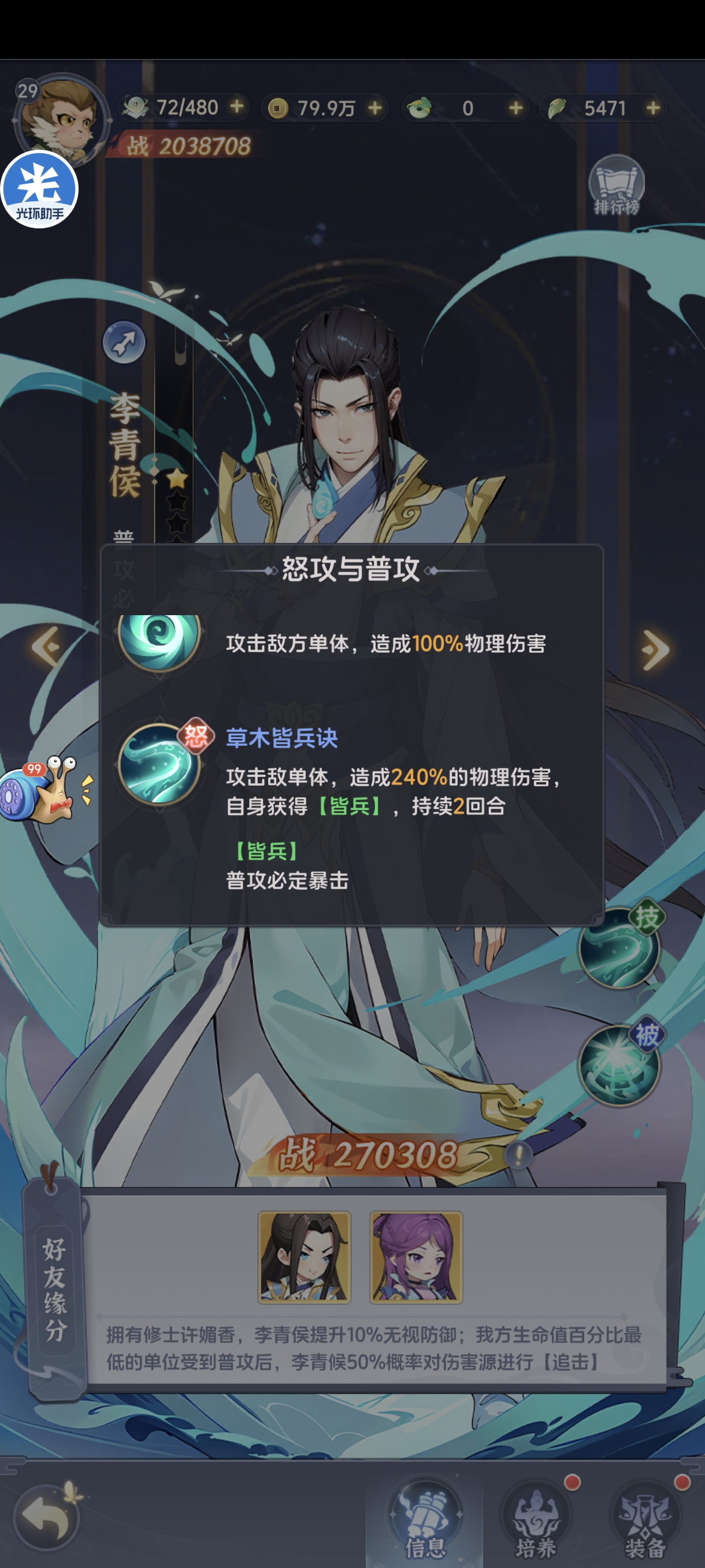 围绕少年白小纯和李轻侯双突击为核心的秒人阵容。白小纯不用多说,前期送超多碎片保送高星,缘分能给所有玄品英雄开场回200点怒气,新手期绝对核心。李轻侯是全游戏单体爆发最高的突击,大招为自身附加必暴击,队友每次行动都能获得1层【催化】,不仅能提高暴伤,还能在行动前回怒,增加大招频率。自身还有两种普攻追击机制,让他在残局时能打出多次连击逆风翻盘。