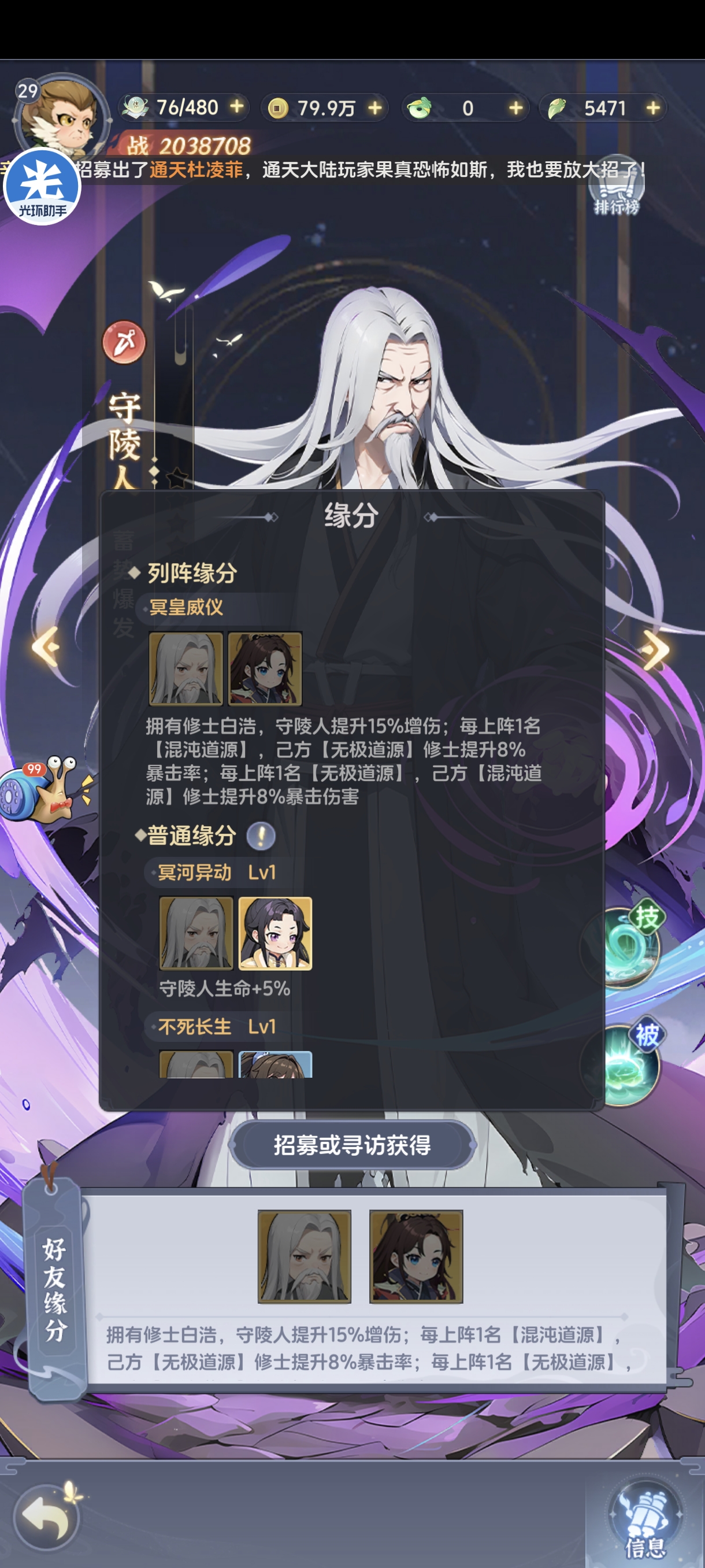 围绕守陵人为核心的防守反击阵容。守陵人拥有非常独特的缘分机制,每上阵1名混沌系英雄都会为无极系英雄+8%暴击,每上阵1名无极系英雄都会为混沌系英雄+8%暴伤,而他自身又是个需要时间叠层,叠满后伤害极高的群攻英雄,所以我们的阵容就全部上阵混沌和无极系英雄,并以高坦度肉盾+奶妈为主。