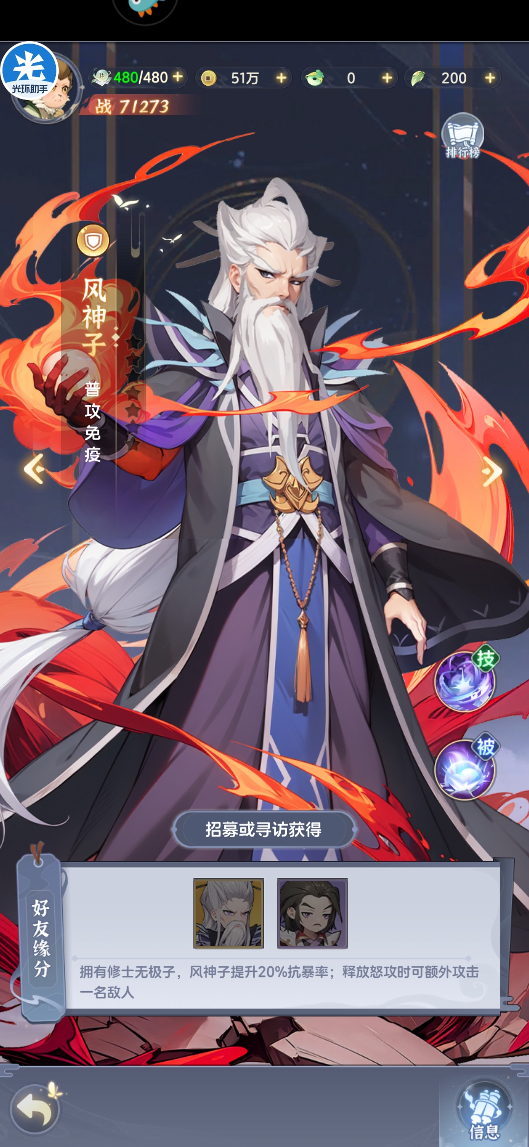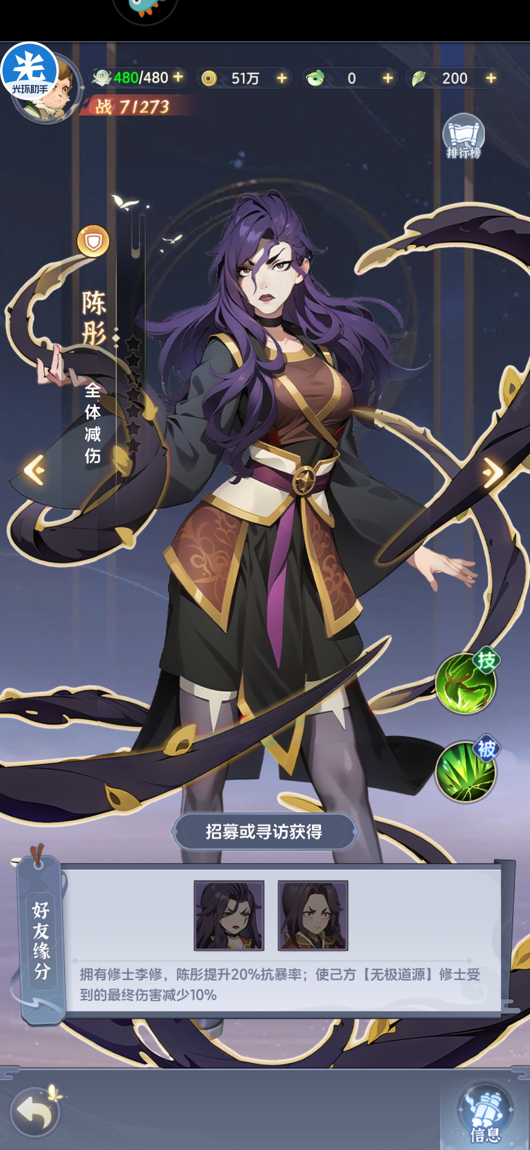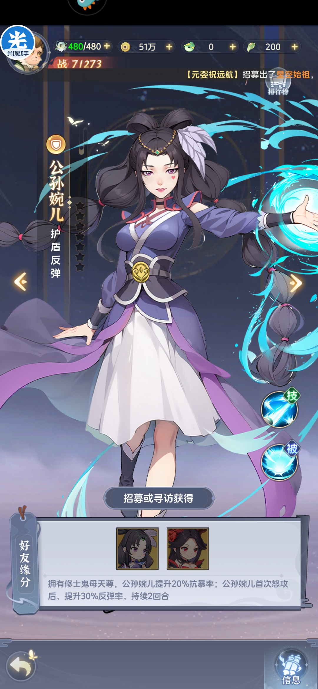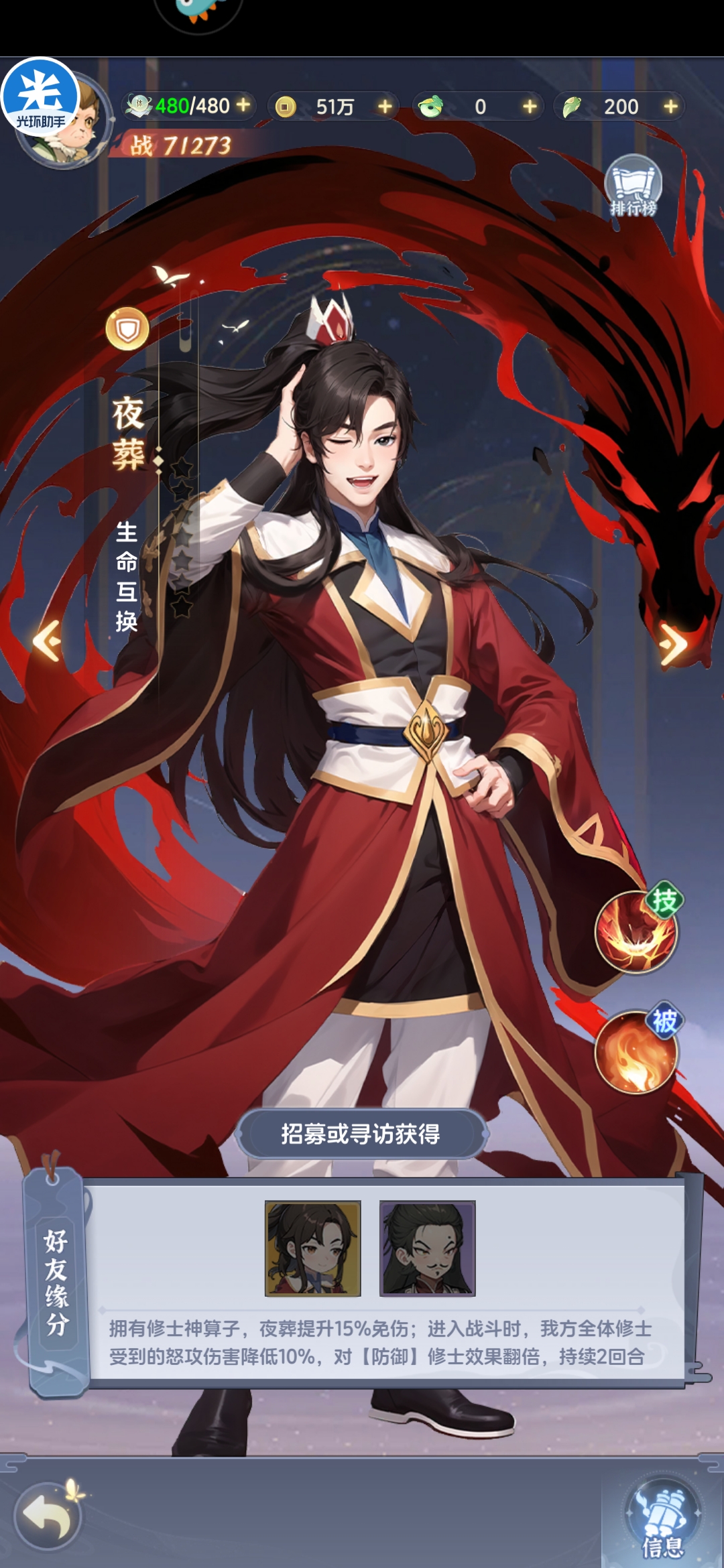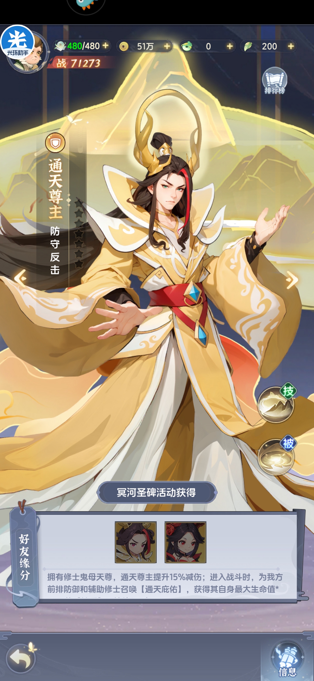 输出型防御英雄,己方单位受击时可以概率触发反击,但反击系数仅为普攻20%,伤害系数过低,虽然技能系数提高,但缺少攻击型英雄破甲增伤等机制,伤害能力亦有限,通天尊主保护机制主要是缘分为防御和辅助提供护盾保证其生存,并不推荐培养,如果缺少副将输出可以考虑多核攻击型英雄,坦度不足可以考虑风神子和夜葬等强势防御型英雄