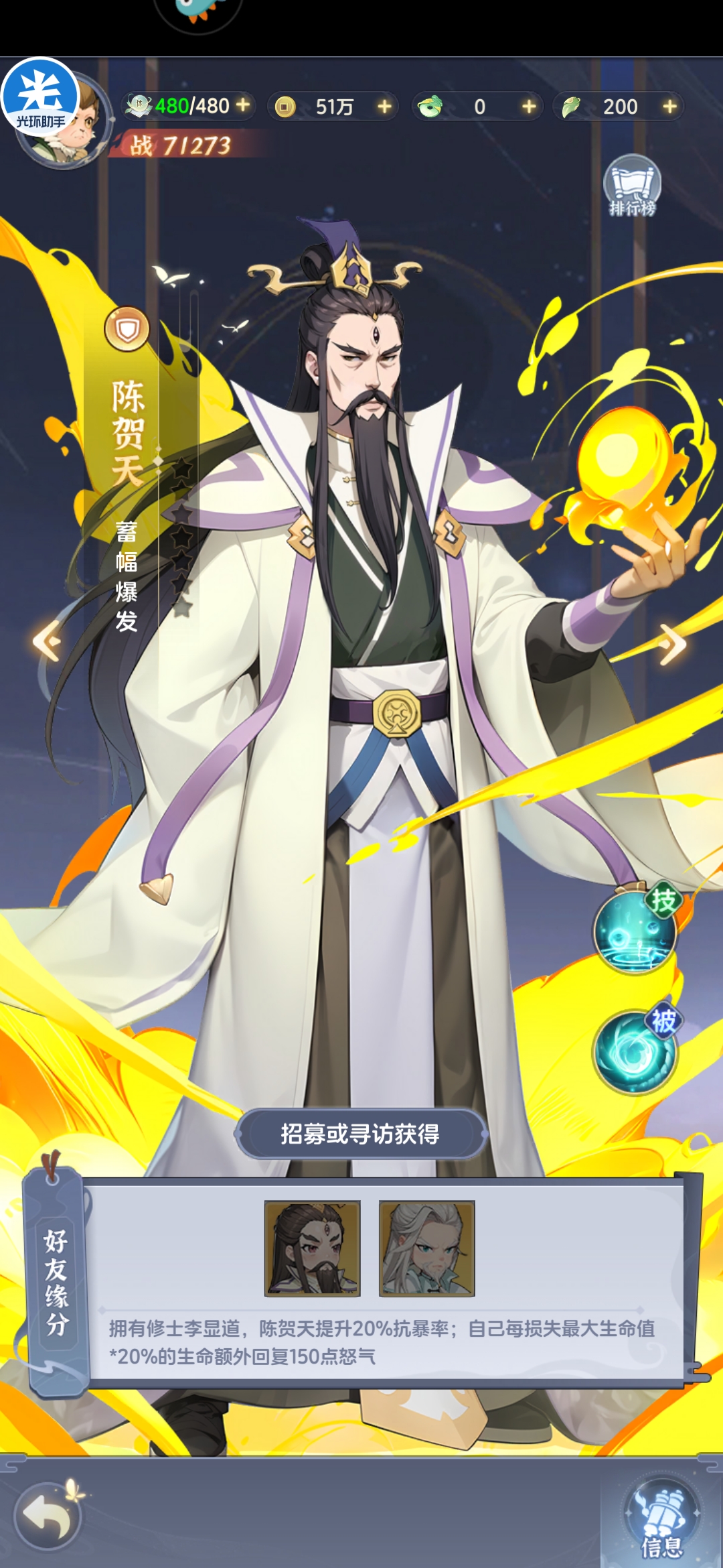 爆发型防御英雄,自带合击技减伤可以保证自身生存,同时怒攻可以针对敌方护盾单位,兼顾护盾驱散+防御吸收,单体爆发能力不错,但陈贺天触发机制并不算优,优先集火护盾单位但破盾率仅50%,同时单体爆发或者群攻能力比不上李天元或者狠人大帝,横向对比没有优势