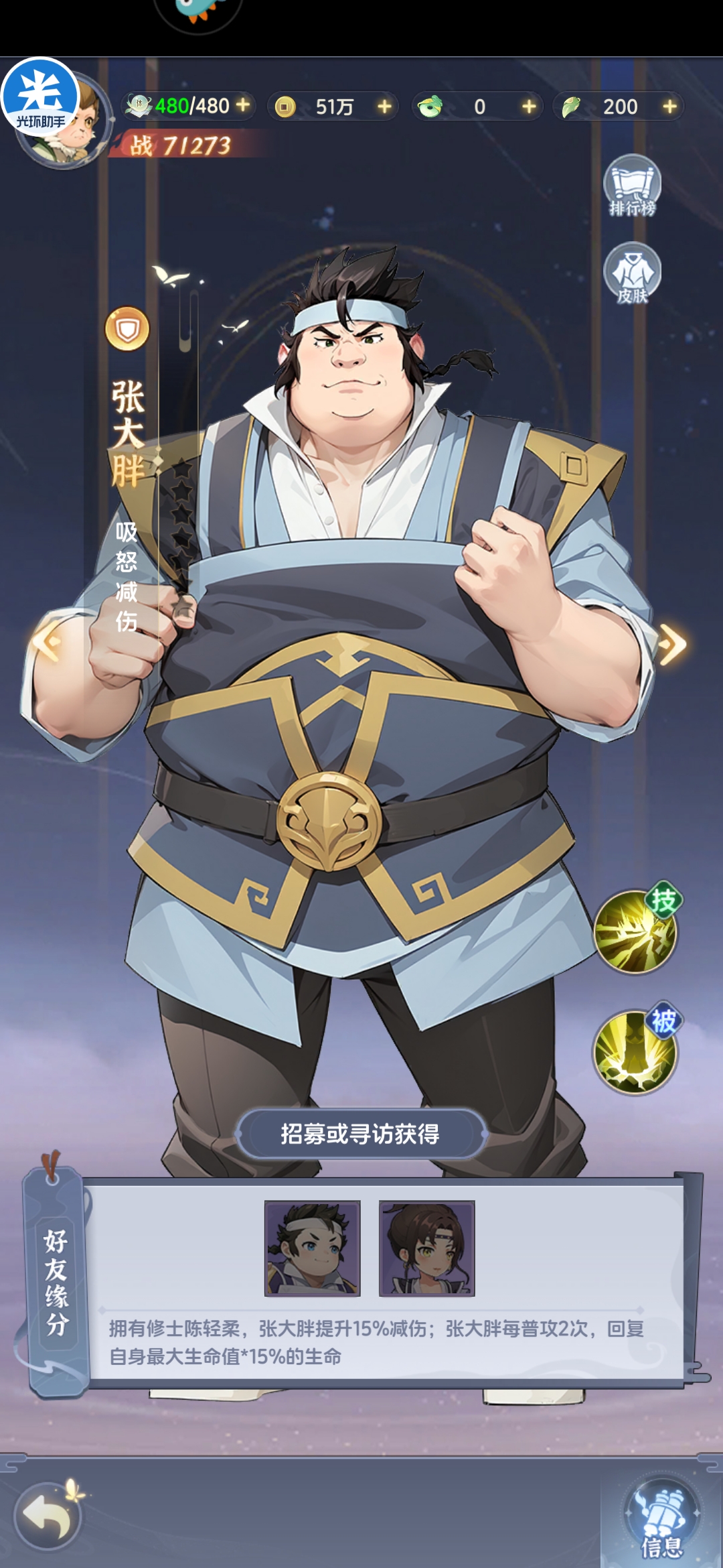 地品高强度英雄,低配版夜葬,功能型较强。受击吸怒+怒攻降低怒气回复拉开双方技能释放频率,同时自身自带怒攻减伤+额外消耗怒气减伤可以保证自身生存能力,前期缺少肉盾可以考虑张大胖过渡,可以有效提高前排坦度