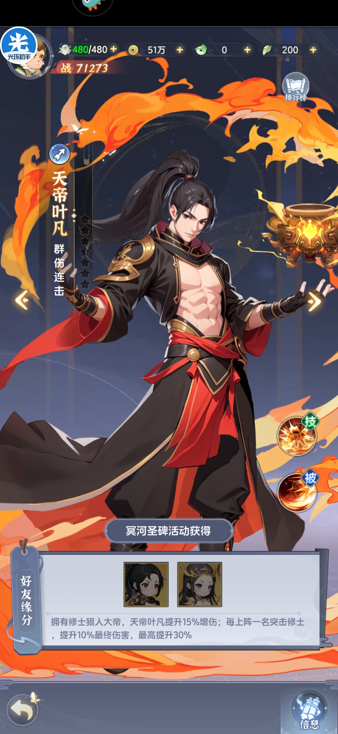 持续消耗型突击英雄,天帝叶凡为灼烧队核心输出,兼顾瞬时爆发和持续伤害,但对练度要求较高,天帝叶凡核心输出在于灼魂持续消耗、天帝极焰真伤和单体附加伤害,但真伤需要依赖玄黄母气状态,神话3星后才可以保证玄黄母气持续获取,保证怒攻真伤能力