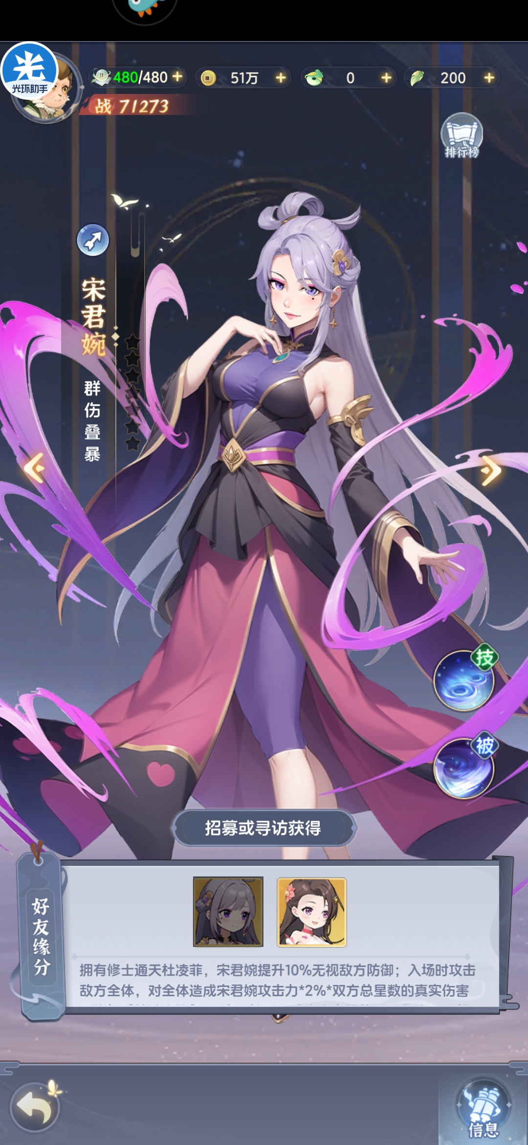 辅助型突击英雄,宋君婉技能并不算强势,敌方单体暴击受到生命上限额外伤害,搭配红拂等叠暴英雄可以快速减员,但触发条件相对苛刻,群伤能力略微欠缺,其核心在于缘分技能登场全体30%生命上限伤害,可以极大程度削减敌方坦度,适合单核成型快速收割阵容如血祖,但中后期多核成型由于输出点不够会相对乏力