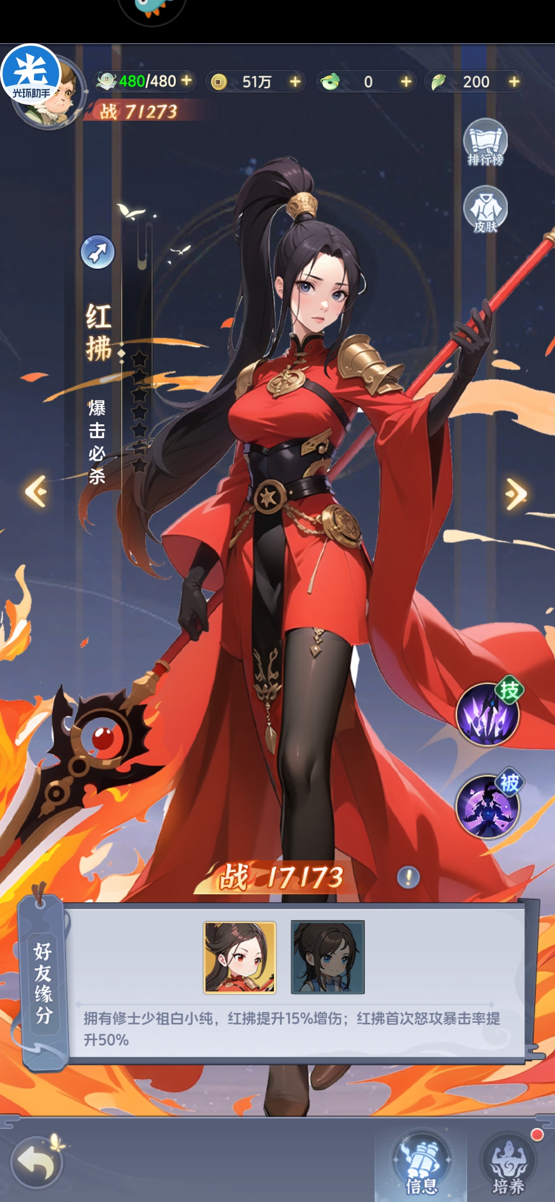 普攻型突击英雄,皆兵状态下普攻必定暴击,搭配可叠加暴击伤害提升和追击机制可以保证自身一回合多段伤害,同时自带怒气回复机制,可以保证怒攻技能频繁释放,保证普攻暴击能力,可以考虑作为副C培养弥补阵容伤害,搭配鬼母天尊加速启动效果更佳