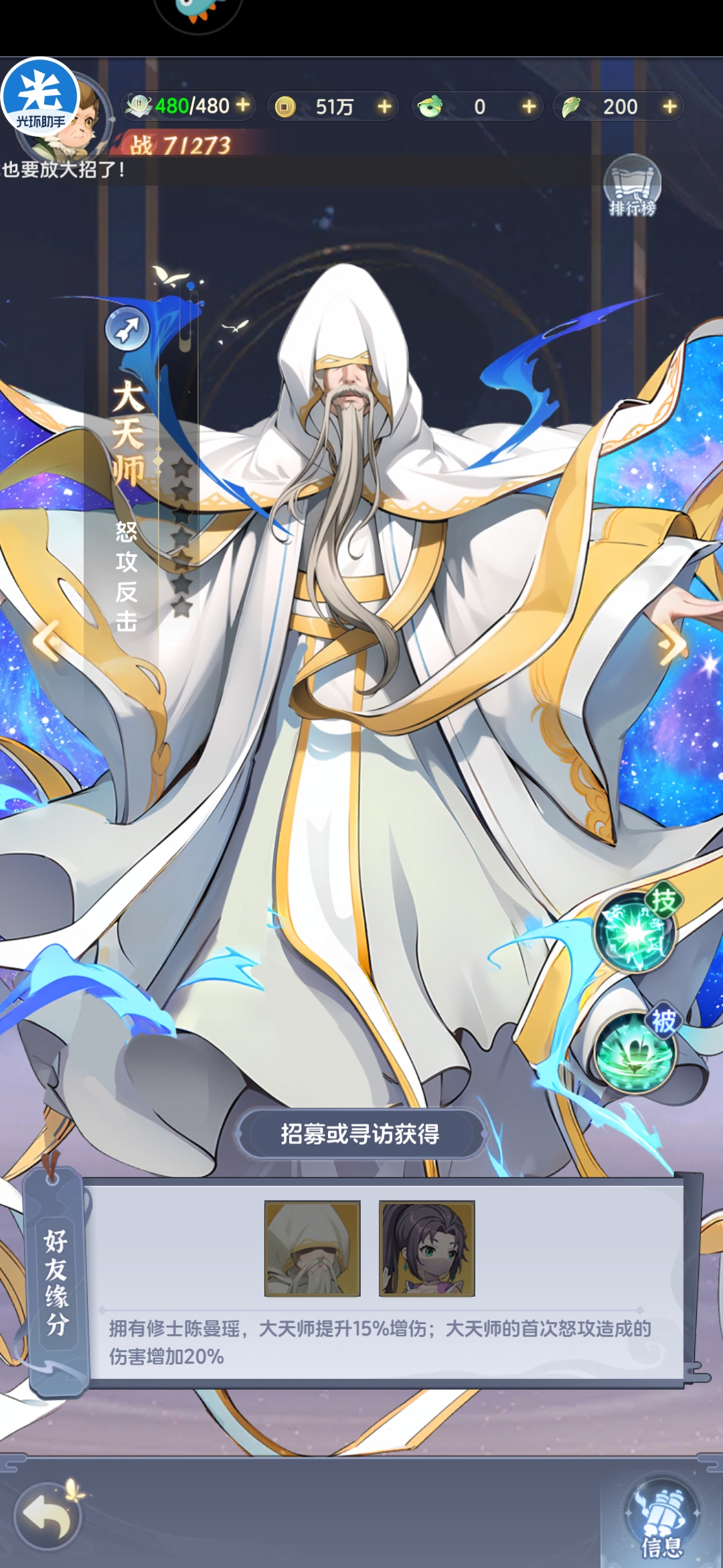 瞬伤型突击英雄,大天师可以利用法印增怒机制实现多次怒攻消耗敌方后排血量,但如果作为主核培养会被鬼母天尊克制,如果作为副将培养伤害能力又相对欠缺,无法有效消耗敌方后排血量,且对战后期相对乏力,可以考虑配合宋君婉达成快速清场的效果