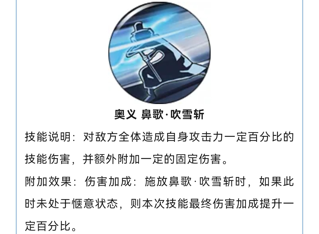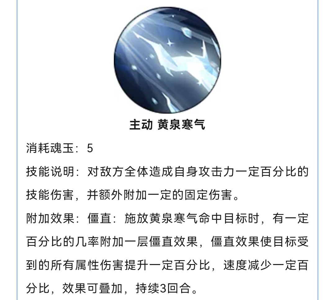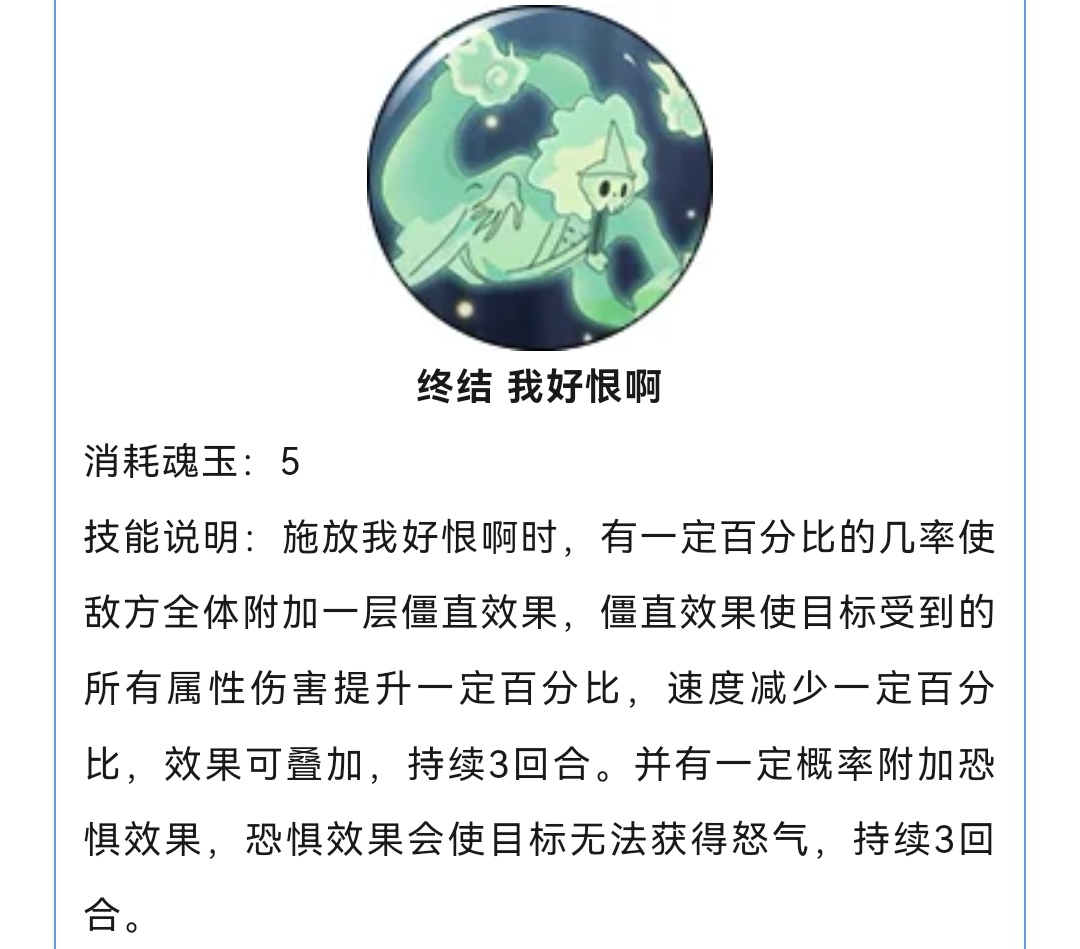 群体控制终结技,释放后可以给敌方全体附加僵直效果,也就是减敌方的速度和提升,受到的属性伤害。而且还有概率让敌方无法获得怒气,两个效果都是持续三回合,如果对方没有消除异常状态的助战或者没上乔巴,那将会很难受。