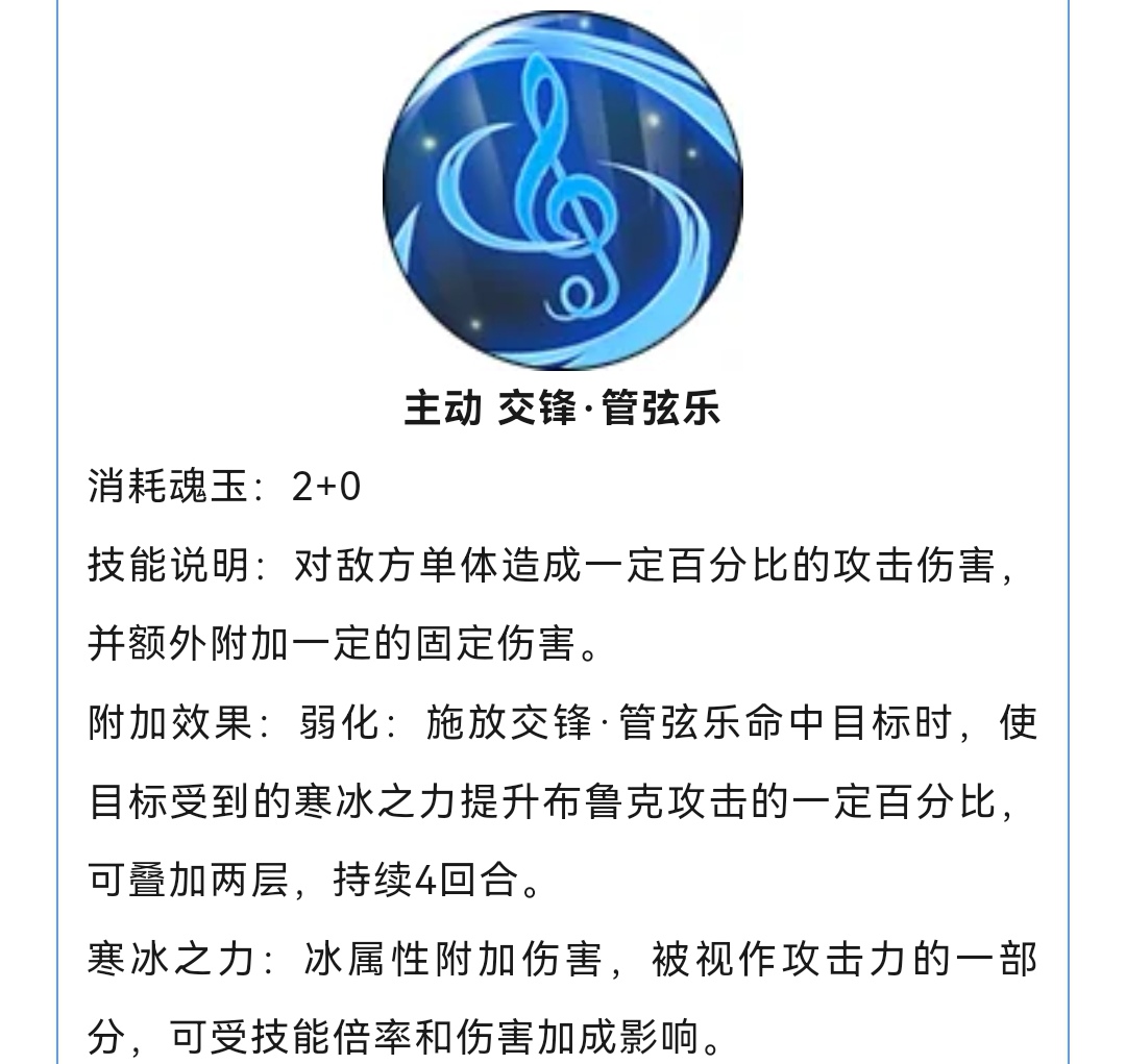 单体主动技,社区可以使布鲁克的攻击提升,而且让目标受到了寒冰之力也提升,寒冰之力就是冰属性伤害的附加,其实跟原来的附加属性差不多,但这次可以受到技能倍率的影响,所以布鲁克的属性伤害是要比以往的角色都高的。