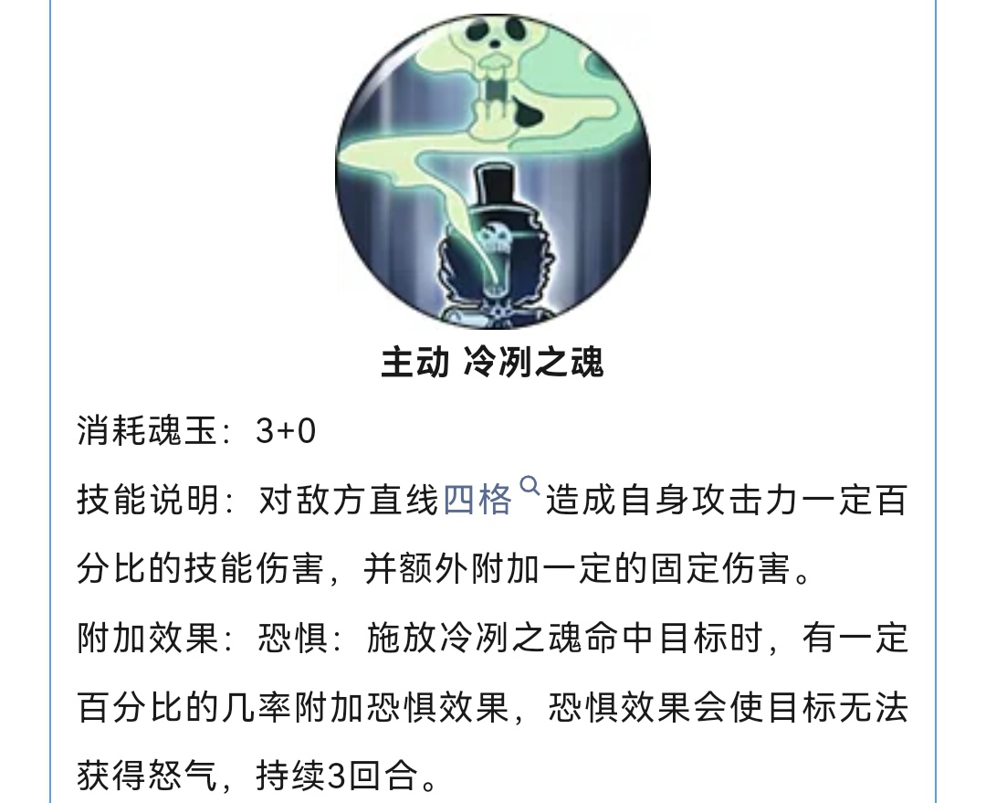 依靠冰属性打伤害,靠着必闪和复活进行生存,同时还可以靠着给敌方减速和附加恐惧打打控制,自身还有着不错的速度和攻击,再配合自带的草帽团辅助加成,可以说是完美。