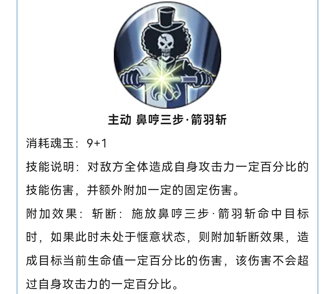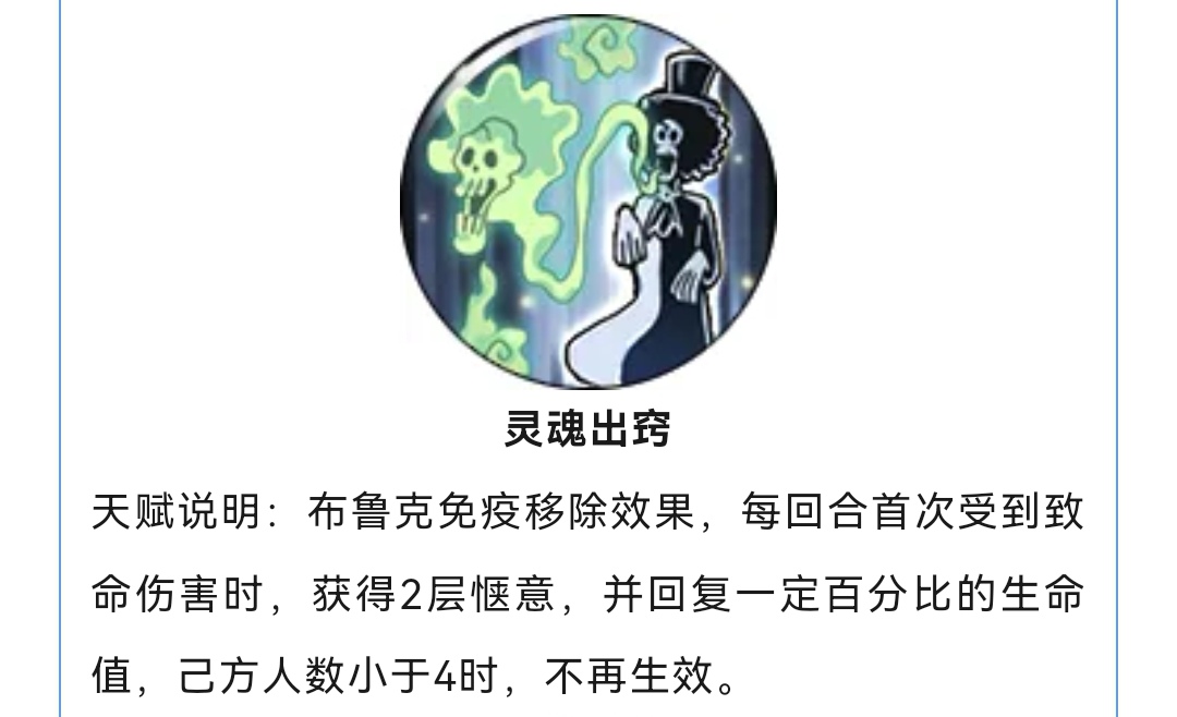 接下来就是布鲁克最主要的生存能力保障,己方除了布鲁克,每有一个草帽角色,都可以使布鲁克获得一回合的必闪效果,不过最多三回合。
