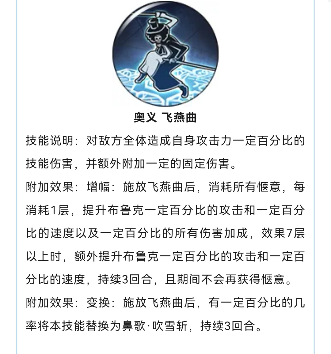 这样看来,布鲁克拥有两个奥义技能,释放后自动切换,具体可以参考大和,不过大和是终结技切换。释放本技能后将消耗所有的惬意,每消耗一层都将获得攻击和速度,如果在消耗七成以上,将额外提升布鲁克的攻击和速度,这个加成的测试服是很高的。
