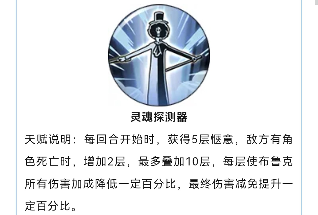 也就是说布鲁克每回合都有一次复活,不过如果己方人数小于4人时,这个复活就不生效了,这也让布鲁克有了一定的生存能力。