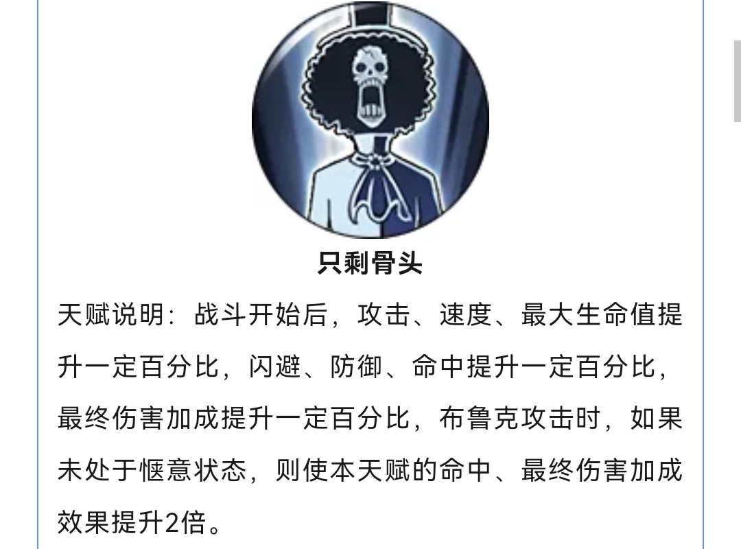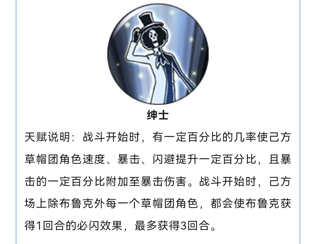这个是辅助天赋,战斗开始时可以让己方的草帽团速度和暴击闪避提升,测试服是40%。
