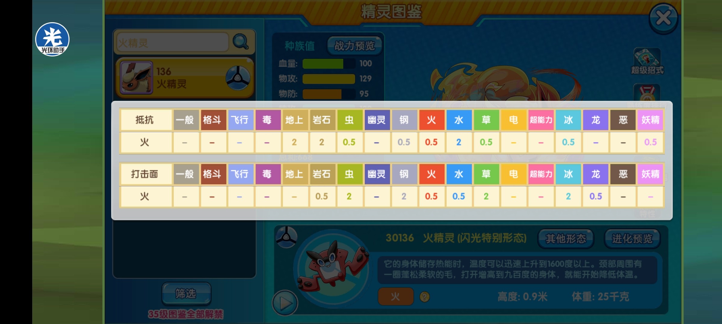 闪光火精灵是单火属性的精灵,有地面系、岩石系和水系三个弱点,但可以抵抗虫系、钢系、火系、草系、冰系还有妖精系,就抗性来说还是非常强大,不过在目前水系当道的情况下,还是要注意联防,而火系目打击面也不错。用威力不俗的技能进行搭配,在PVP中还是占有一定优势。