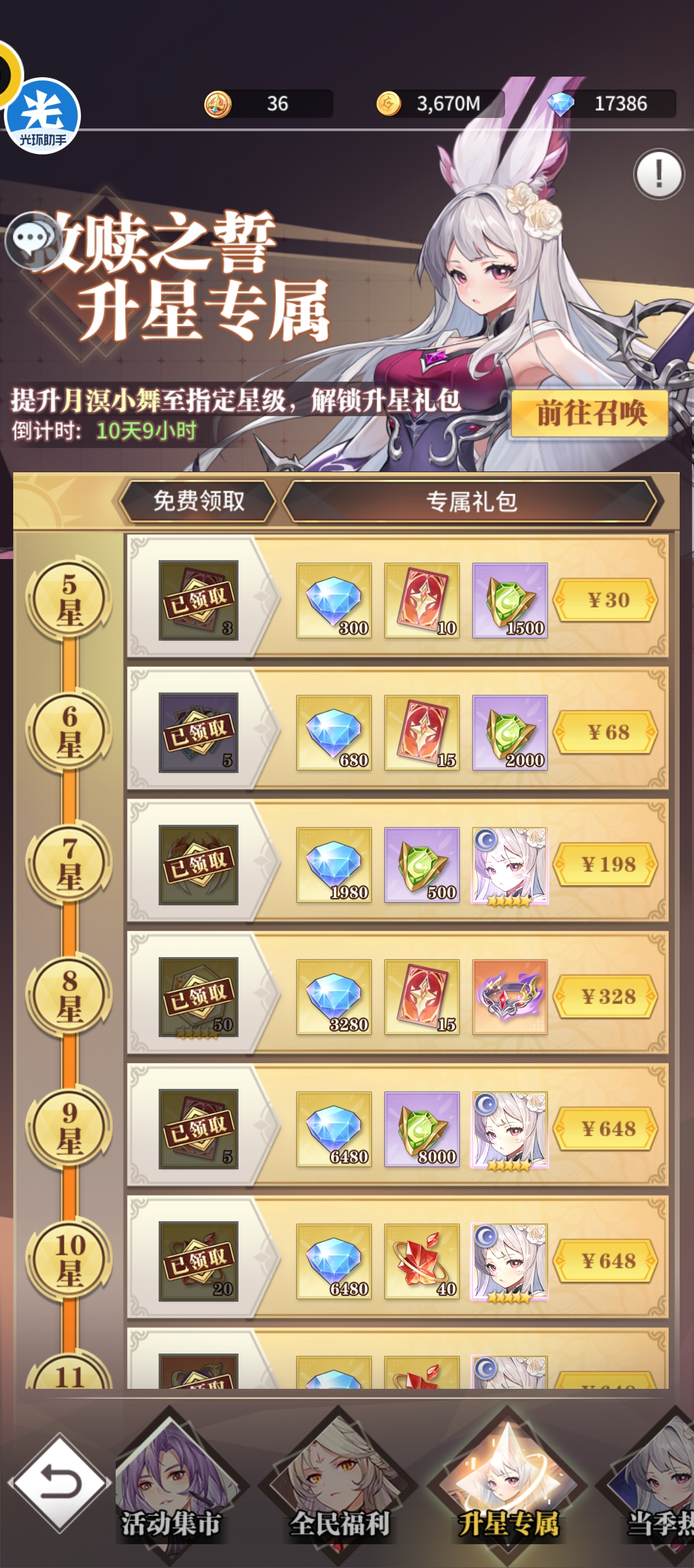 第一天超值卡包98元80限定契约+当季热卖30元10限定契约,第二天当季热卖68元+68元+6元共35限定契约,第三天当季热卖128元30限定契约,第四天升星68元+30元+月卡30元共25限定契约,第五天128元30限定契约,第六天128元30限定契约,第七天128元30限定契约+专属升7星198元+累充送35张限定契约。合计305限定契约花费1108元,基本可以获得2保底本体+抽卡送80碎片+每日累充100碎片,爱心等级拉满可得50碎片,专属7星50碎片,合计2张+1.6张+2张+1张+1张+1张=7.6张,再加上送的两张,能够让月溟小舞升到10星。这个阶段是性价比最高的充值方式。