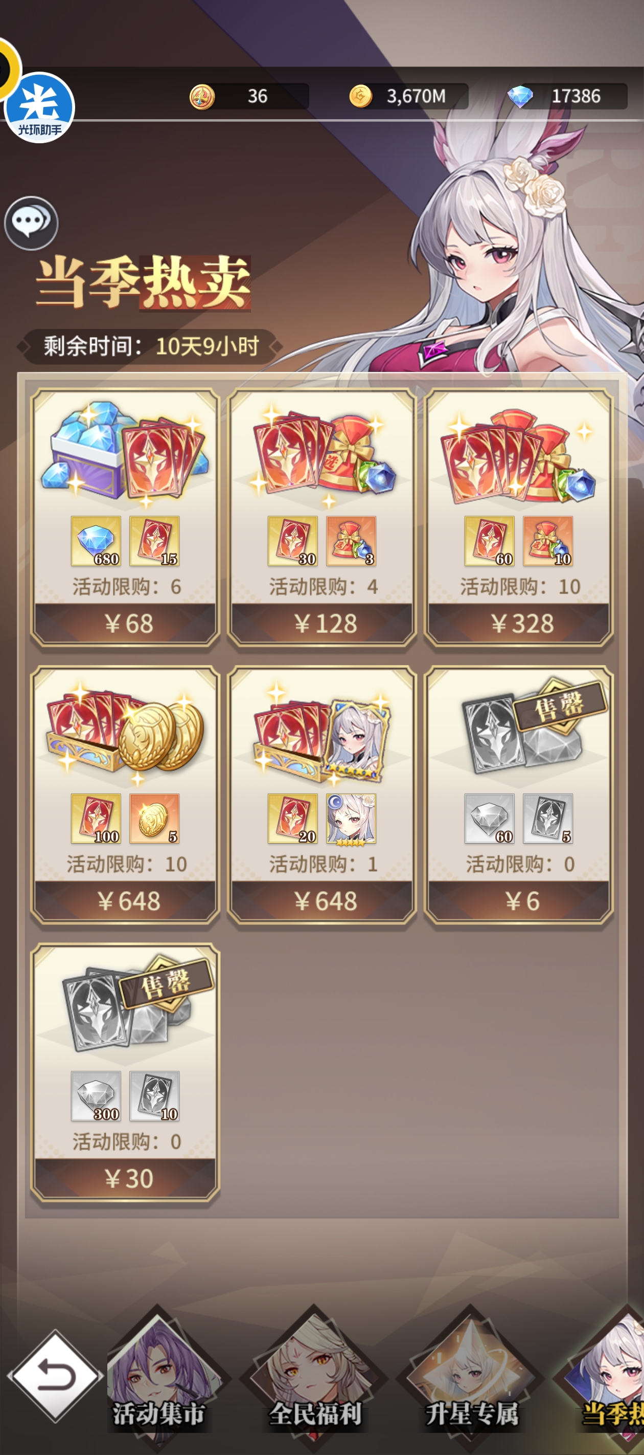 其他同上,第七天加注氪金,当季热卖648元获得1本体+20限定契约,当季热卖648元100抽+当季热卖328元*10有600限定契约,加上前面300抽,共花费5596元,合计1020抽,8.6张+2.4张+1张+5张(700抽卡,只要不是大非酋)=16张,可以选择继续加注购买升星专属9星10星11星12星极限648元*4=获得4张本体多96抽+当季热卖648*2获得200抽+10祈祷币,加上送的2张,16+4+2+2=24张本体成神,共计花销9484元,当然实际费用更低,因为这算是按照保底计算。
