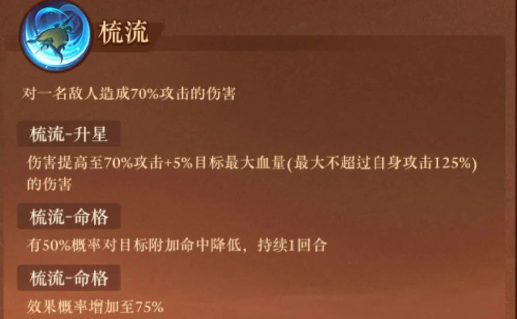 1技能为:【梳流】。对一名敌人造成70%的伤害。升星效果是可以让1技能附加5%目标最大生命值的伤害。