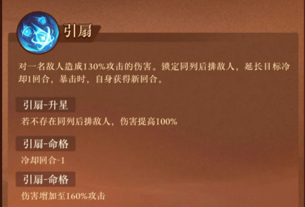 2技能为:【引扇】。2技能是铁扇的核心技能,可以锁定后排敌人,延长目标的cd,同时如果触发暴击,自身就可以获得新的回合。