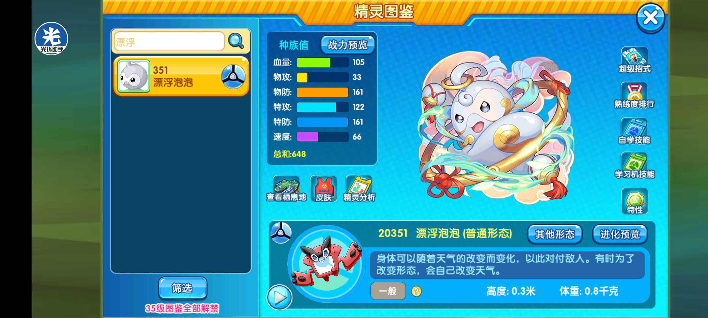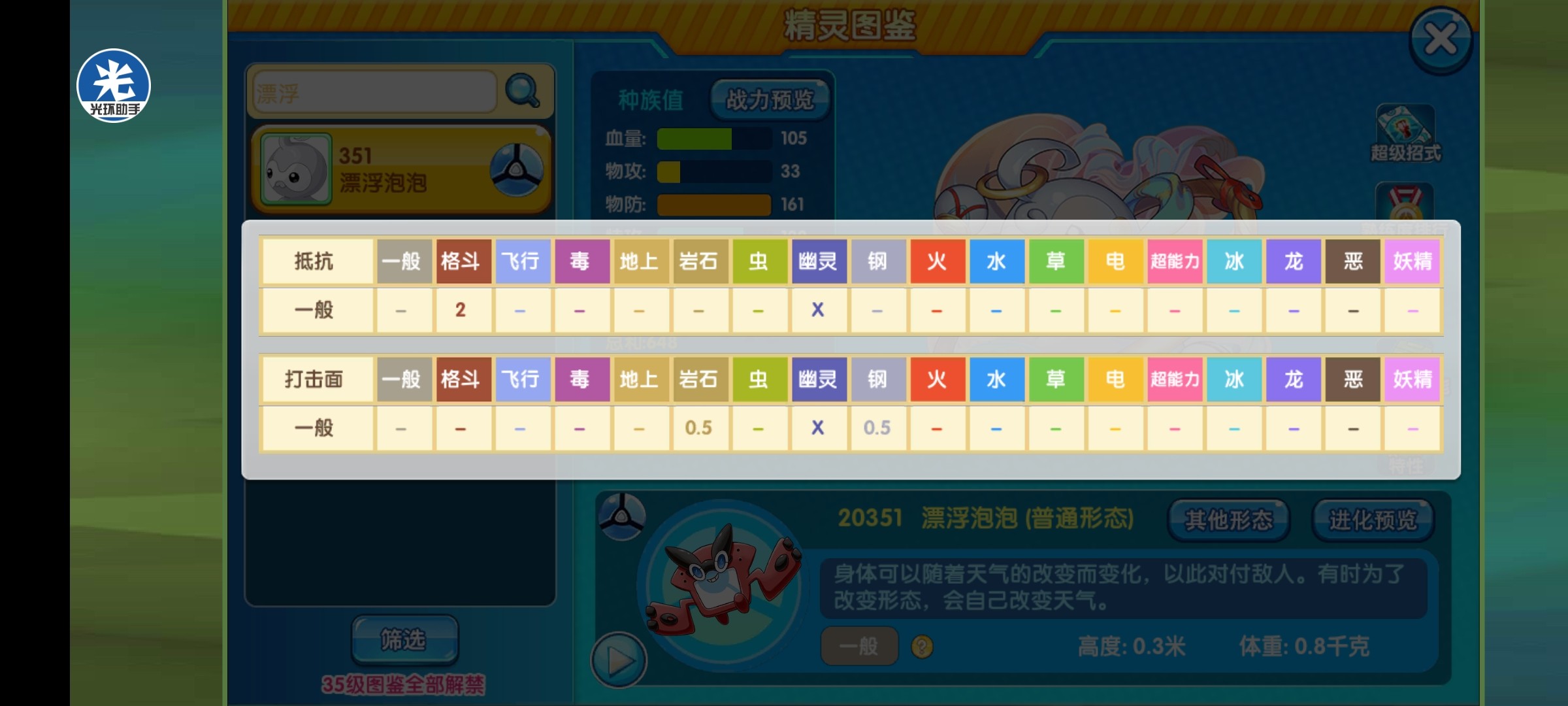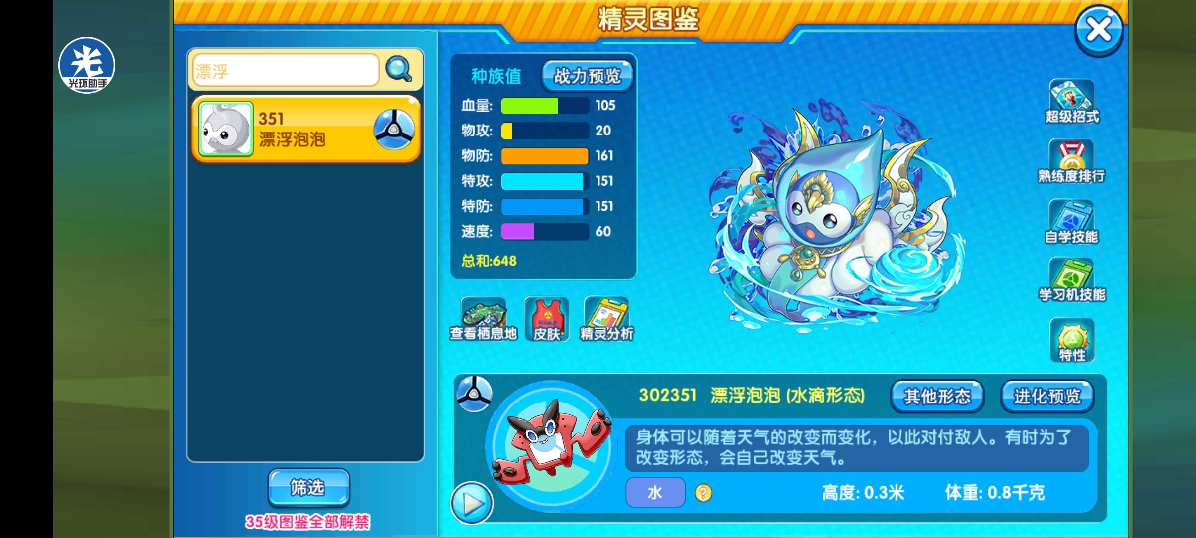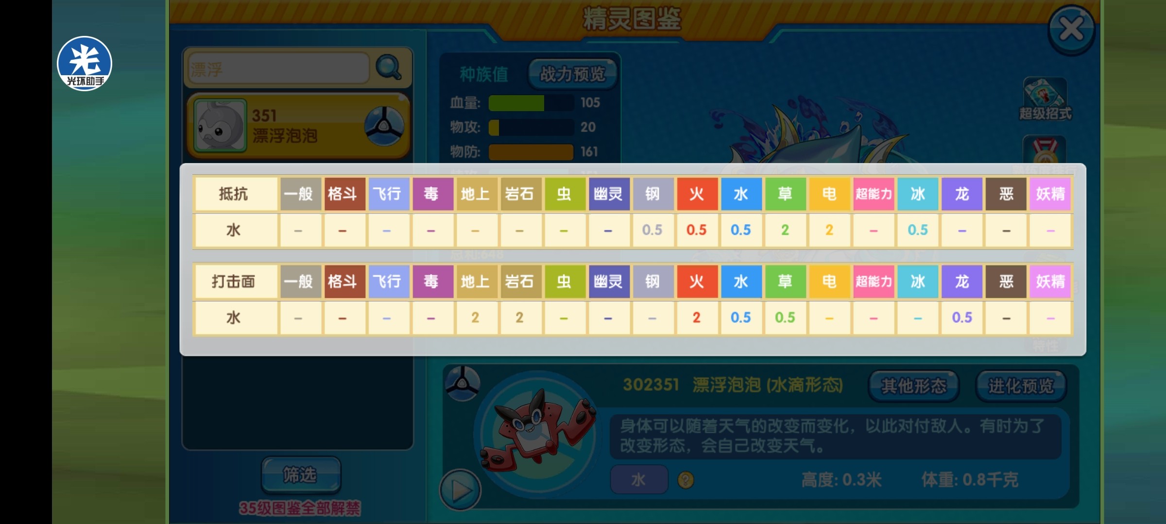 漂浮泡泡在原版中就是一个特殊的精灵,外形会随着天气而变化,例如气温与湿度等天候的变化似乎都会其细胞造成影响。飘浮泡泡从阳光、雨云和雪云中能够获取改变自己外形的能量,但是因为一般的种族,在对战中出场机会并不多,而本次更新中也是给出了它的mega形态,不是闪光哦,普通就可以进化,这样普通玩家也可以玩,那么本次,就给大家介绍这只特殊的天气宠物。