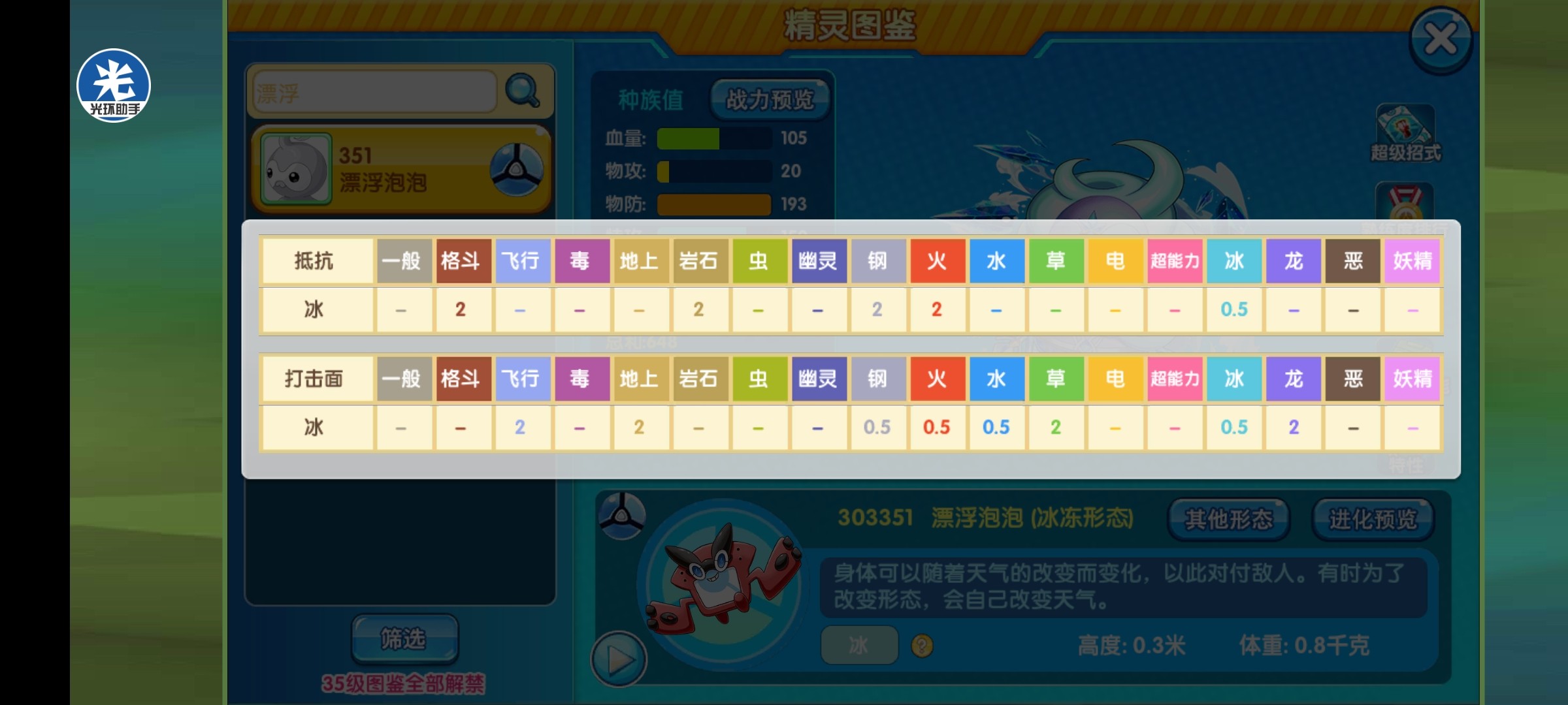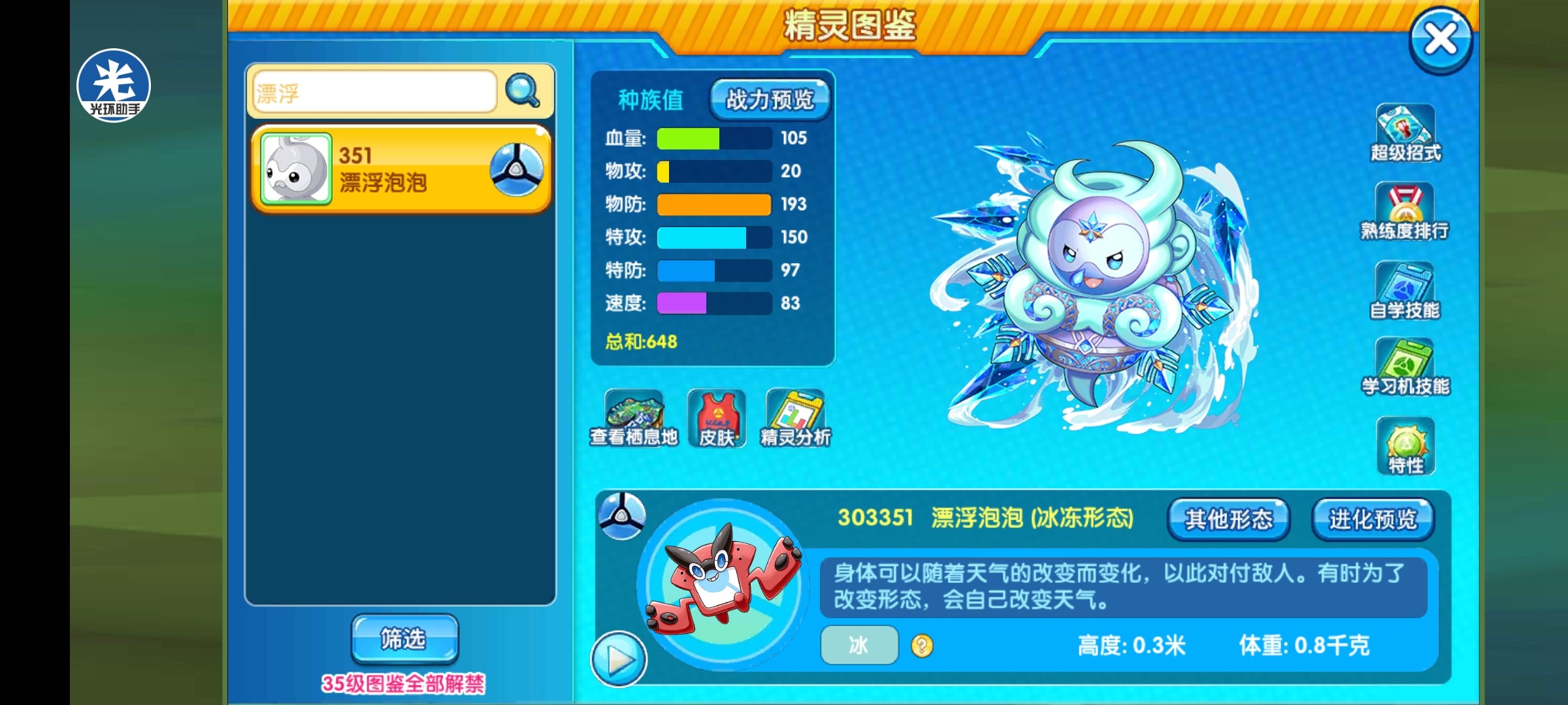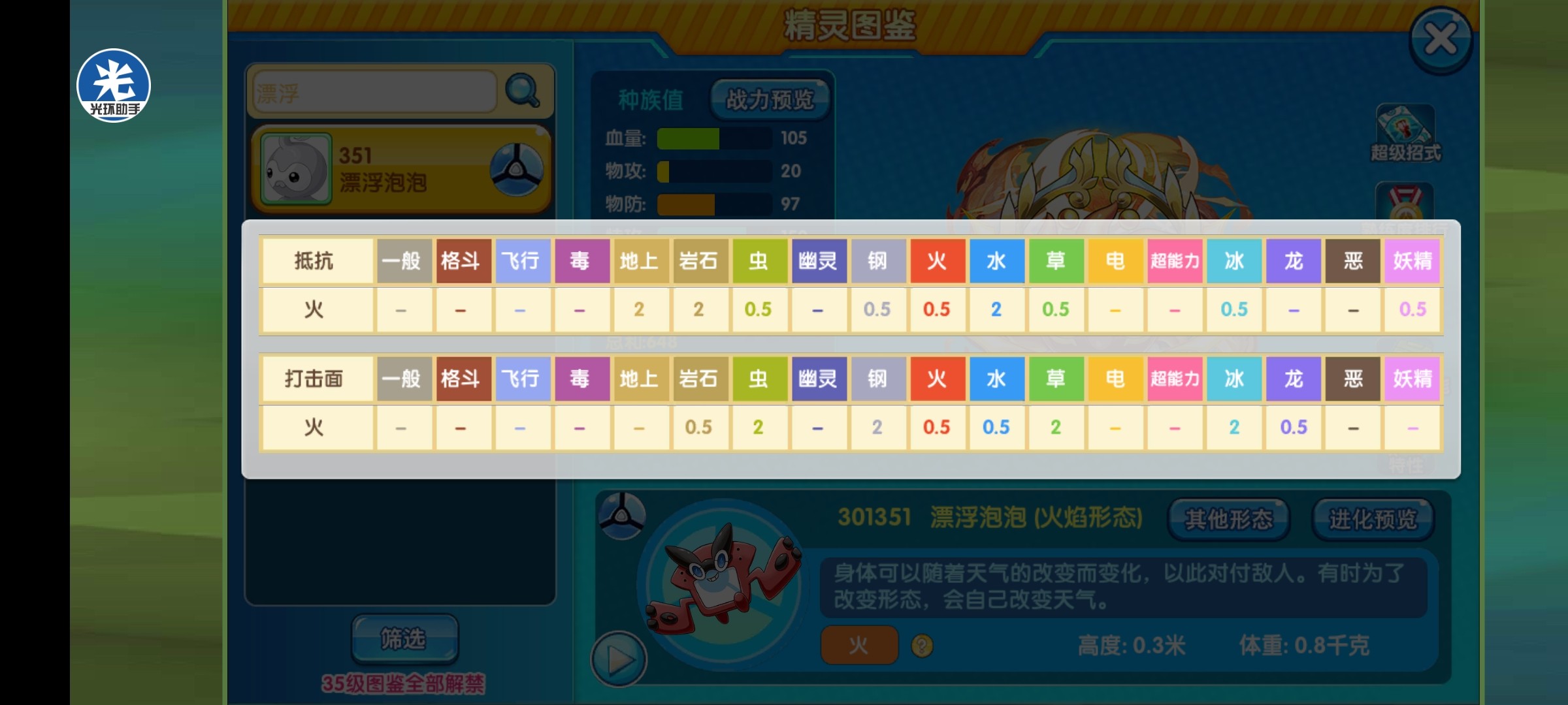 漂浮泡泡在原版中就是一个特殊的精灵,外形会随着天气而变化,例如气温与湿度等天候的变化似乎都会其细胞造成影响。飘浮泡泡从阳光、雨云和雪云中能够获取改变自己外形的能量,但是因为一般的种族,在对战中出场机会并不多,而本次更新中也是给出了它的mega形态,不是闪光哦,普通就可以进化,这样普通玩家也可以玩,那么本次,就给大家介绍这只特殊的天气宠物。