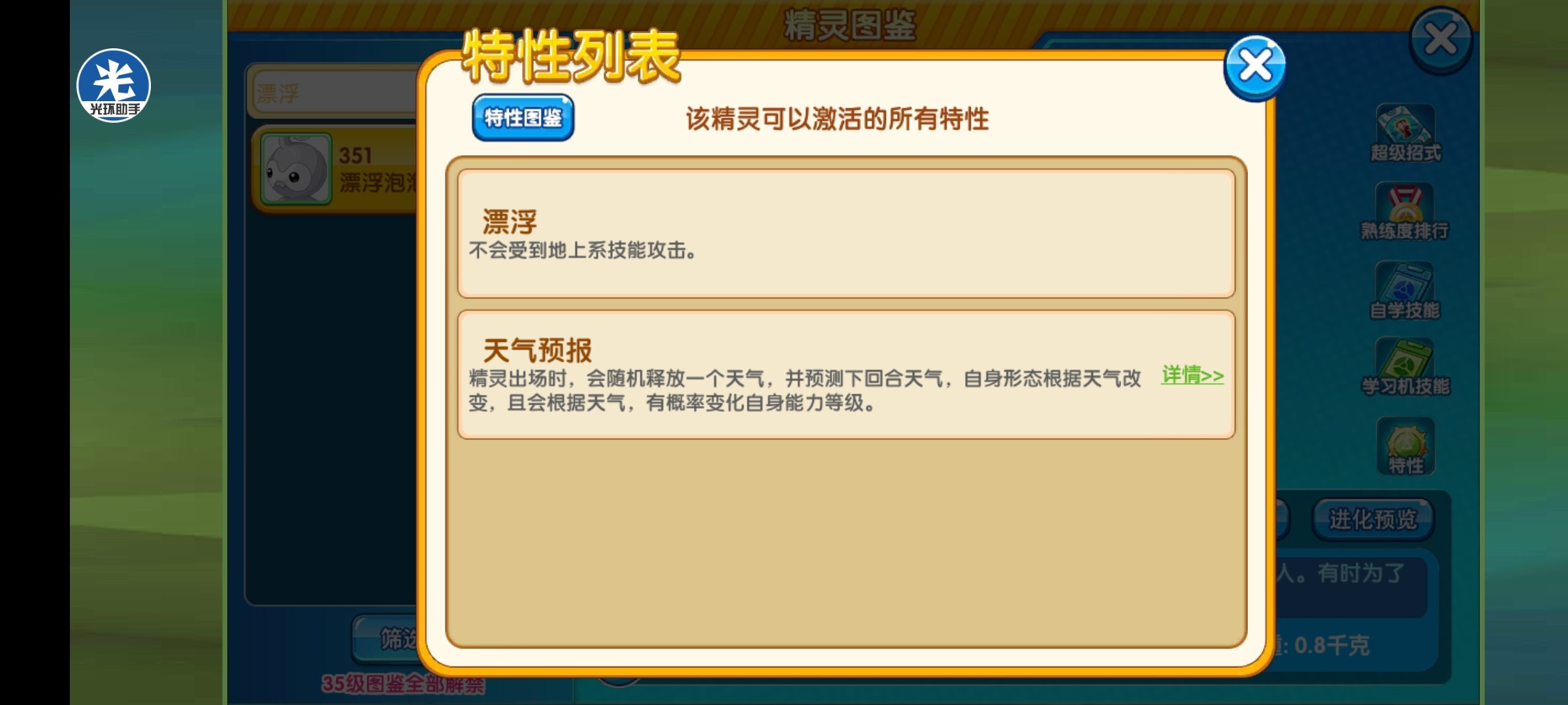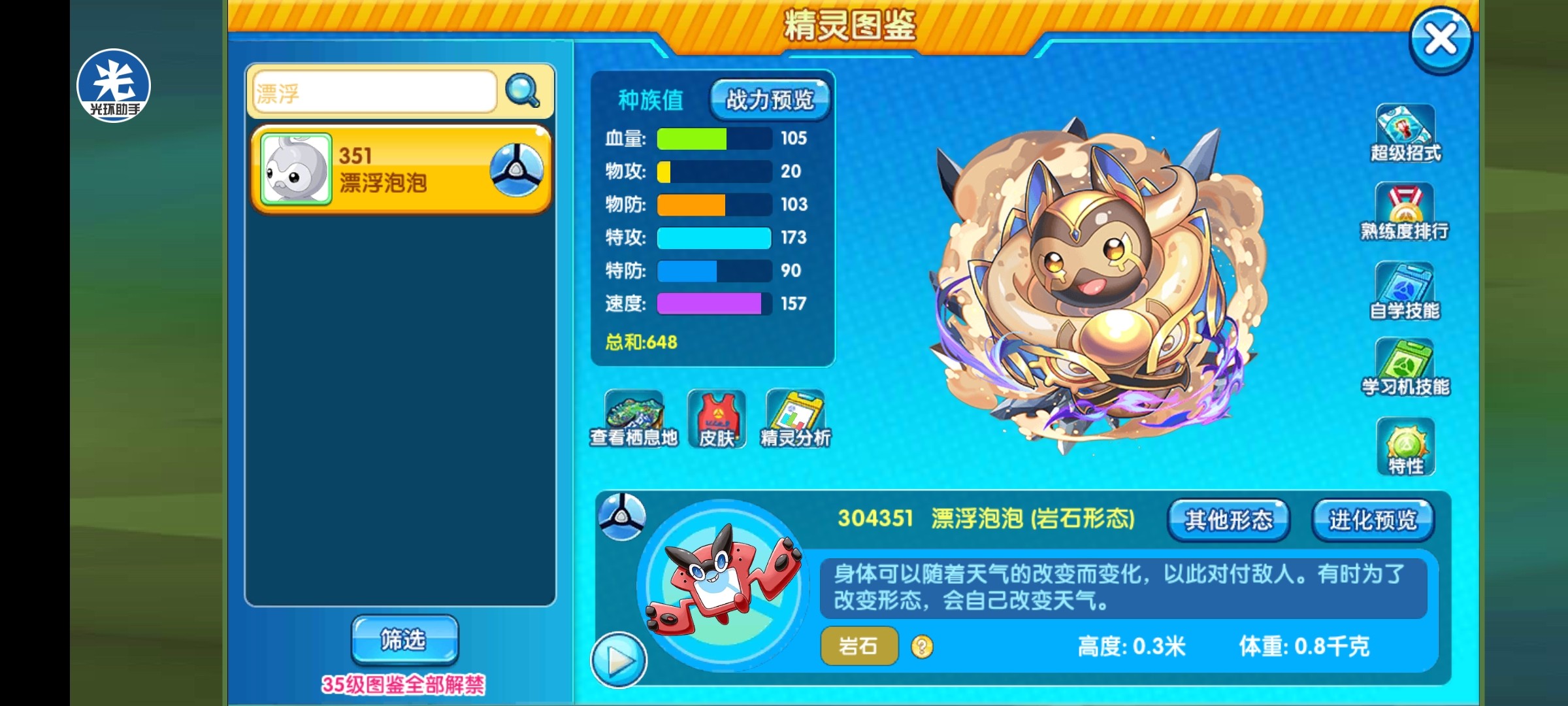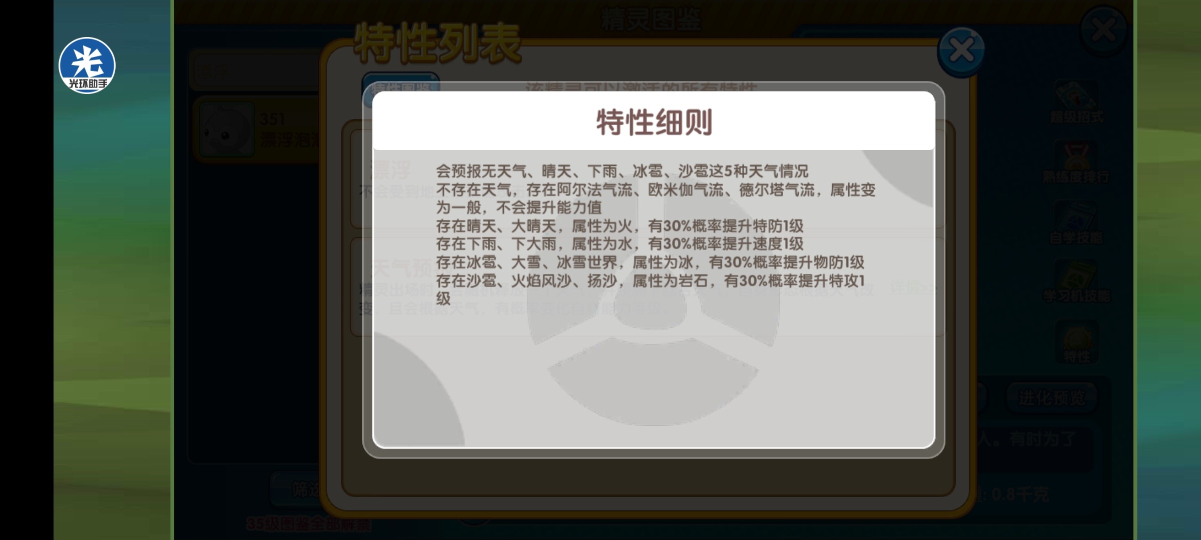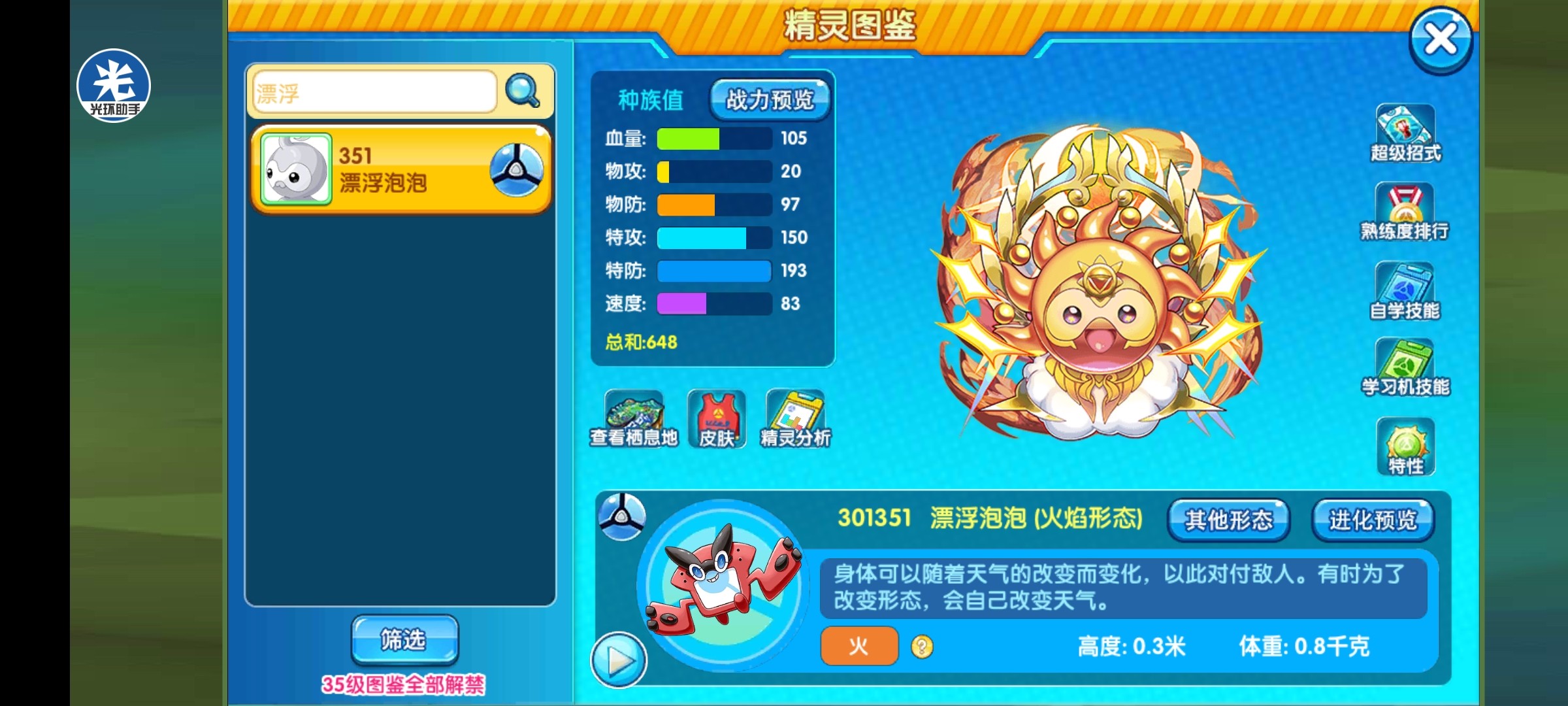 漂浮泡泡在原版中就是一个特殊的精灵,外形会随着天气而变化,例如气温与湿度等天候的变化似乎都会其细胞造成影响。飘浮泡泡从阳光、雨云和雪云中能够获取改变自己外形的能量,但是因为一般的种族,在对战中出场机会并不多,而本次更新中也是给出了它的mega形态,不是闪光哦,普通就可以进化,这样普通玩家也可以玩,那么本次,就给大家介绍这只特殊的天气宠物。