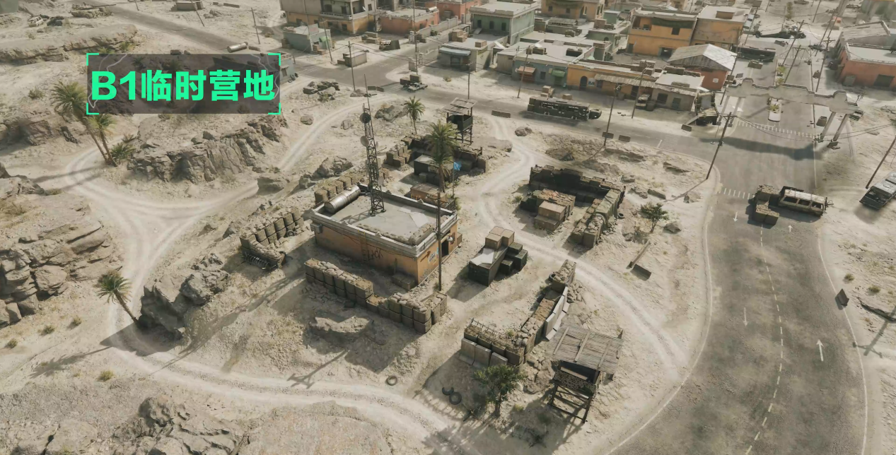 B1为临时营地,以内部的独立建筑为核心,四周有一圈沙土围墙和两座简易哨塔。