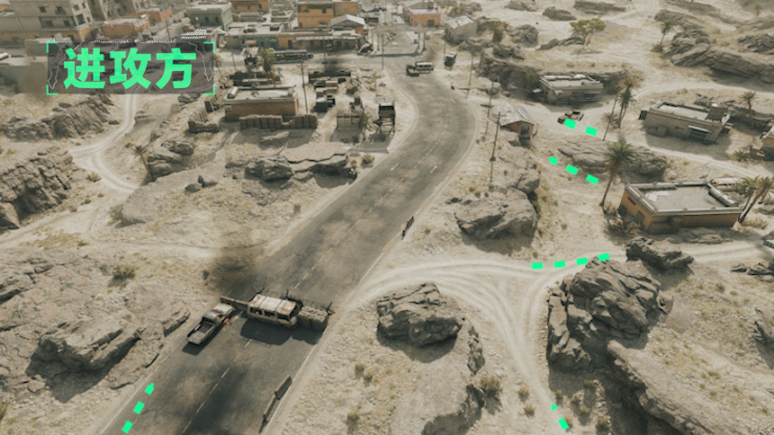 防守方虽然可以凭借围墙等掩体躲避直射火力,但广阔的外围空间缺乏掩体,无法长期维持防御。所以利用好有限的地形优势,将进攻方的兵力尽可能多地消耗在公路南侧是个不错的办法。