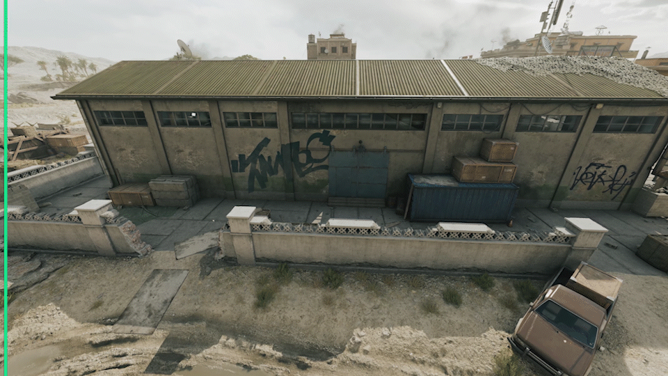 虽然仓库内二层的固定机枪火力能够无死角防御正门的进攻。但仓库墙体可破坏,北部的两个后门防守薄弱,容易被进攻方走小巷绕后偷袭。所以对于进攻方来说,破坏围墙并且多个通道同步进攻是最好且最快的压制手段。