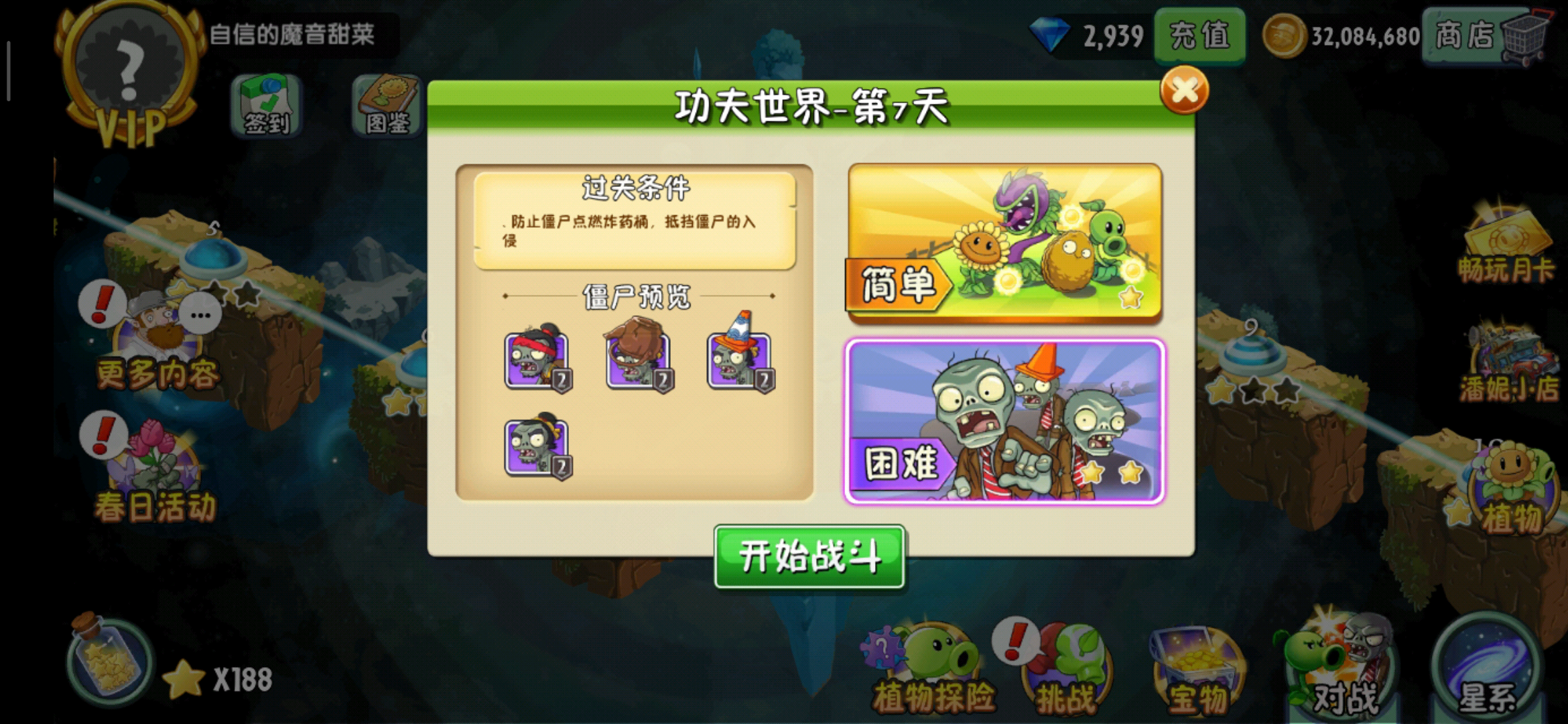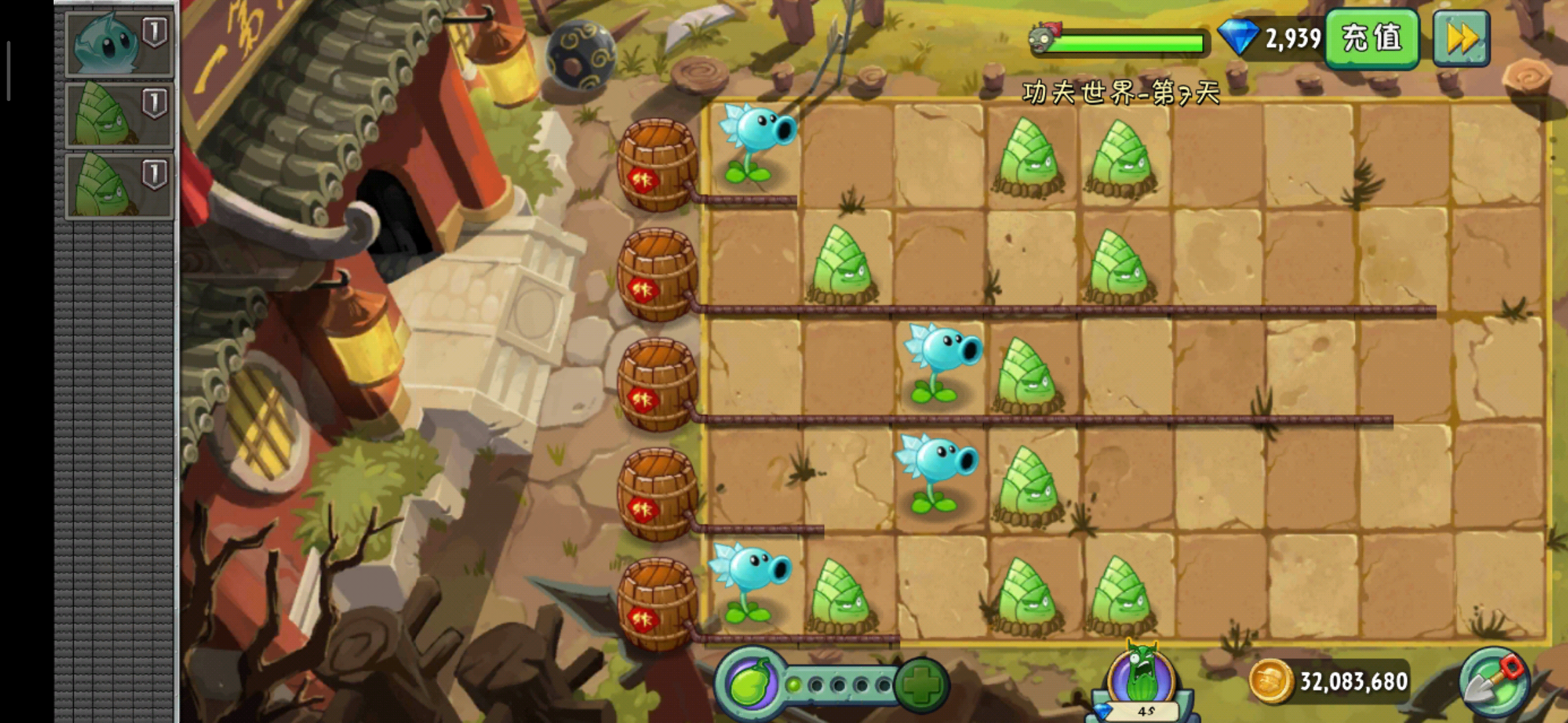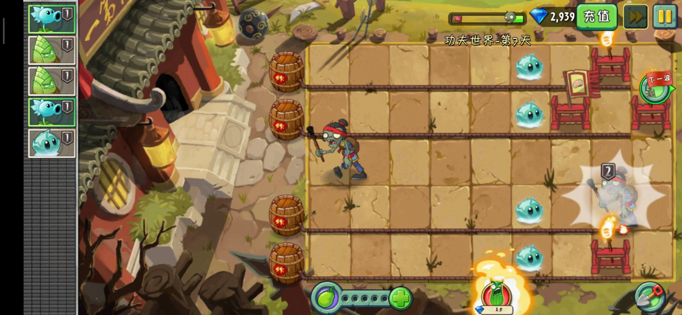 首先这一关中登场了一个新植物——竹笋,竹笋的攻击比较有特点,它的攻击模式跟地刺差不多,只不过它可以攻击前方四列的植物,攻击速度还不慢,而且还属于范围攻击,只不过伤害略微低一些了。还有另外两种植物是寒冰射手和冰冻生菜,这两株植物就比较有针对性了,根据通关的要求,这一关中会出现大量的功夫火把僵尸,而寒冰射手和冰冻生菜是可以将火把的火焰熄灭的,看似不错哦,而且竹笋属于小个子植物不会被火把烧掉,看来这一关会简单一些吗?才怪。