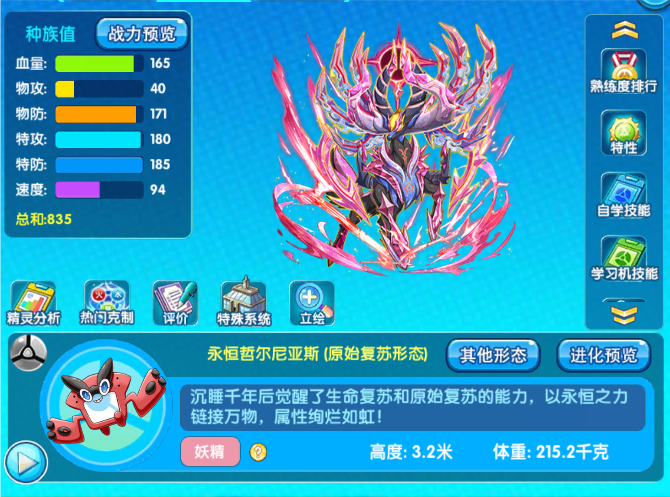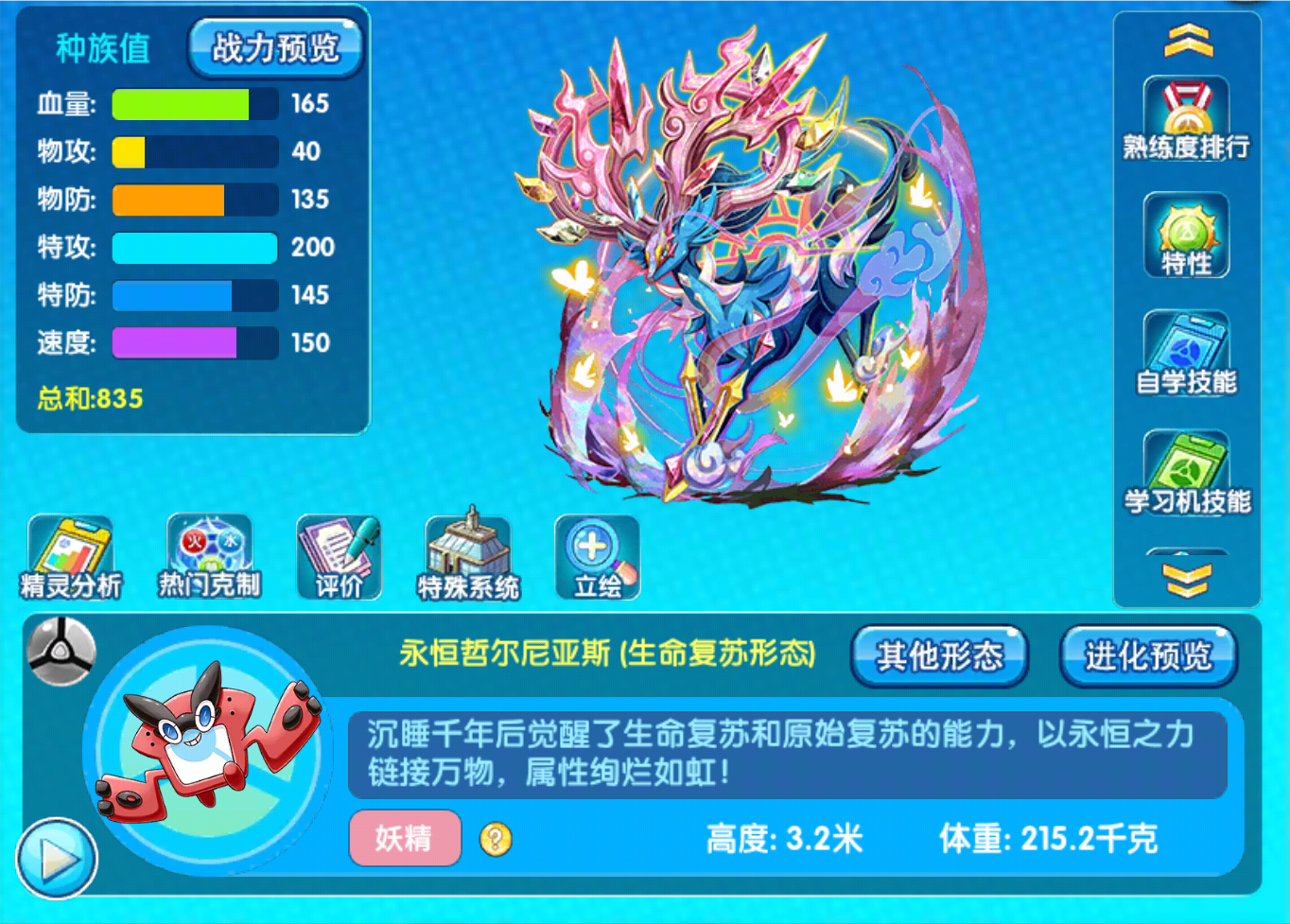 至于输出形态,可以学习两种复苏招式复苏浪潮和复苏侵蚀这两个技能,后者这个技能还是要多提一嘴,就是一个恶属性的追击效果,还有两个技能位置,可以考虑加入打击面,最好是霜和大地之根,可以应对一些特殊的情况,就比如说钢铁超梦02,因为这个精灵可以让别的精灵的技能多消耗,而且这个永恒哲尔尼亚斯最怕的也就是自身的专属技能不够,而这个钢铁超梦02刚好可以克制所以有必要考虑带上个克制技能针对一下。最后关于这个精灵,我只想说,强度肯定是比较强的,毕竟是一个新的9999,但是能强势多长时间就不知道了,毕竟下半年更是节日,很多中秋节,国庆节,还有双11,还有一些杂七杂八的小节日,没有永远强势的精灵,只有不断割韭菜的策划