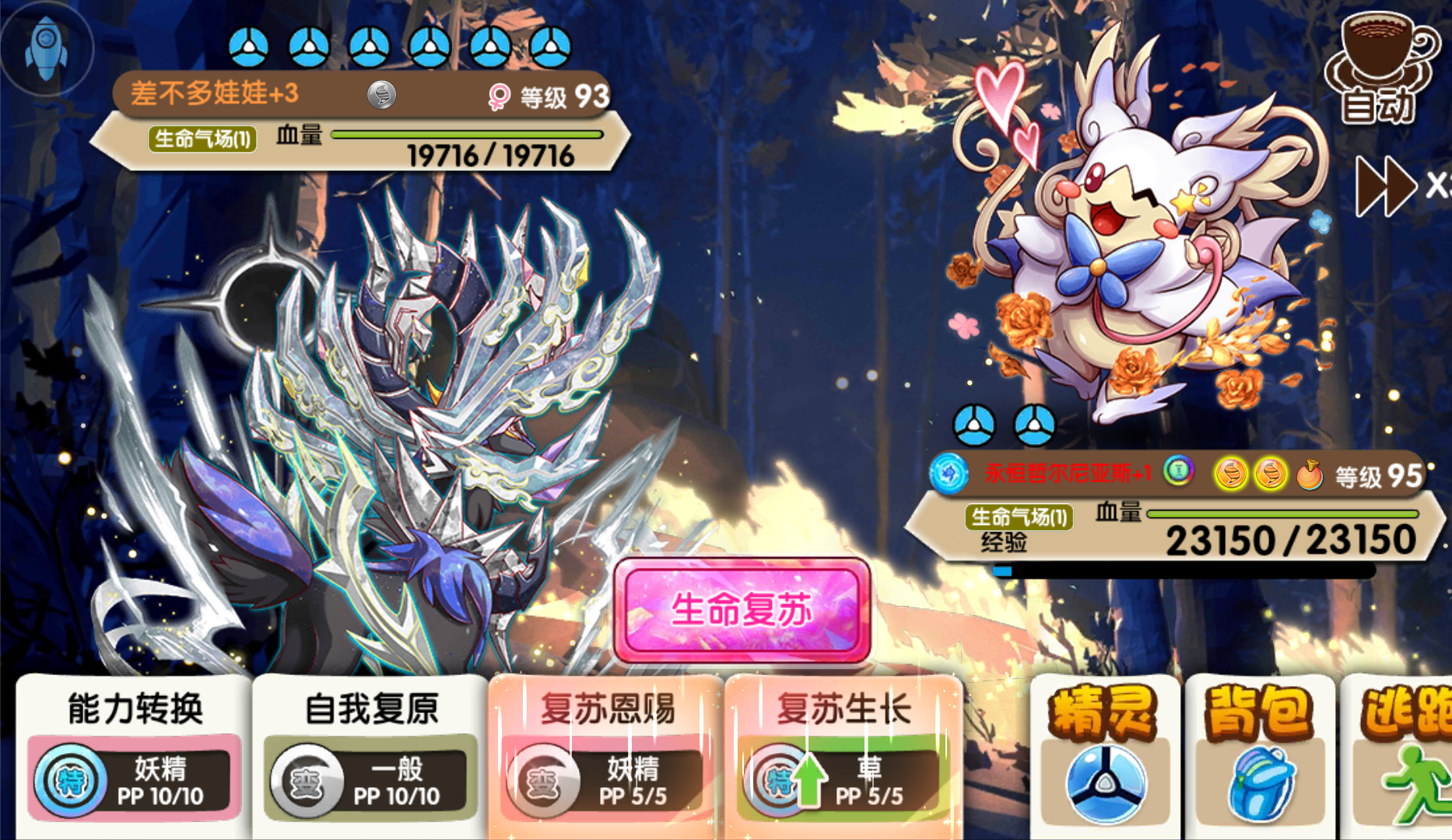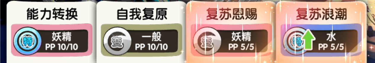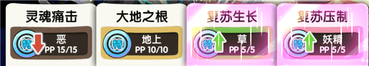 这里讲一下吧,技能方面的情况,在上篇文章当中已经有写明了这个复苏技能的具体介绍,大家可以去链接里面看,其实这个精灵的打击面是相当丰富的,我这边试验的技能是这个样子的,在肉形态情况下是搭配了强化和回血也可以把复苏浪潮和复苏生长和两个技能交换一下,因为复苏生长这个技能可以让对方陷入到寄生种子状态是一种防御技能,至于复苏浪潮,可以让对方受到多段伤害,专门打掉对方的锁链绷带,还有一些减伤道具,所以这个技能可以给输出形态使用,不过一般两种形态是前面两个技能可以使用常规技能,后面两个技能位置则必须要使用复苏技能,说白了,在常规搭配技能的时候,只需要在一二位置选择关键的技能就可以了,至于三次技能,可以提前学习比较好的技能,然后到后面可以及时调换,把三四位置调换到一二位置,这样就方便很多了