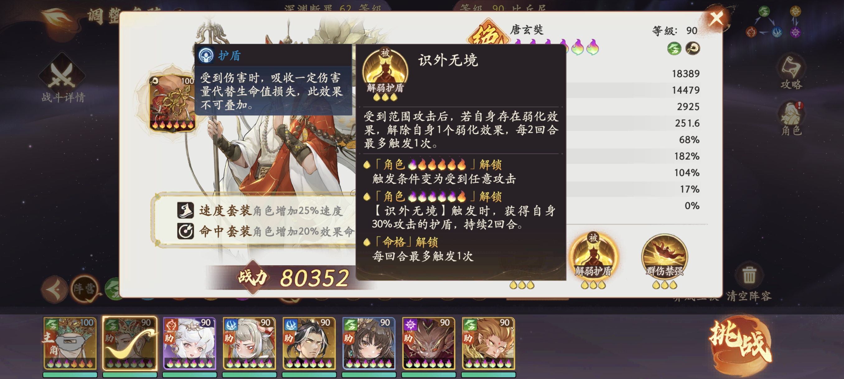 *本关要点,唐僧先手大招时,会受到2个沙和尚的反击,如果不触发护盾就会直接被打成空血,所以此处需要凹一下沙和尚的反击降攻,只有触发降攻唐僧才能获得护盾,抵消一部分伤害从而活下来。