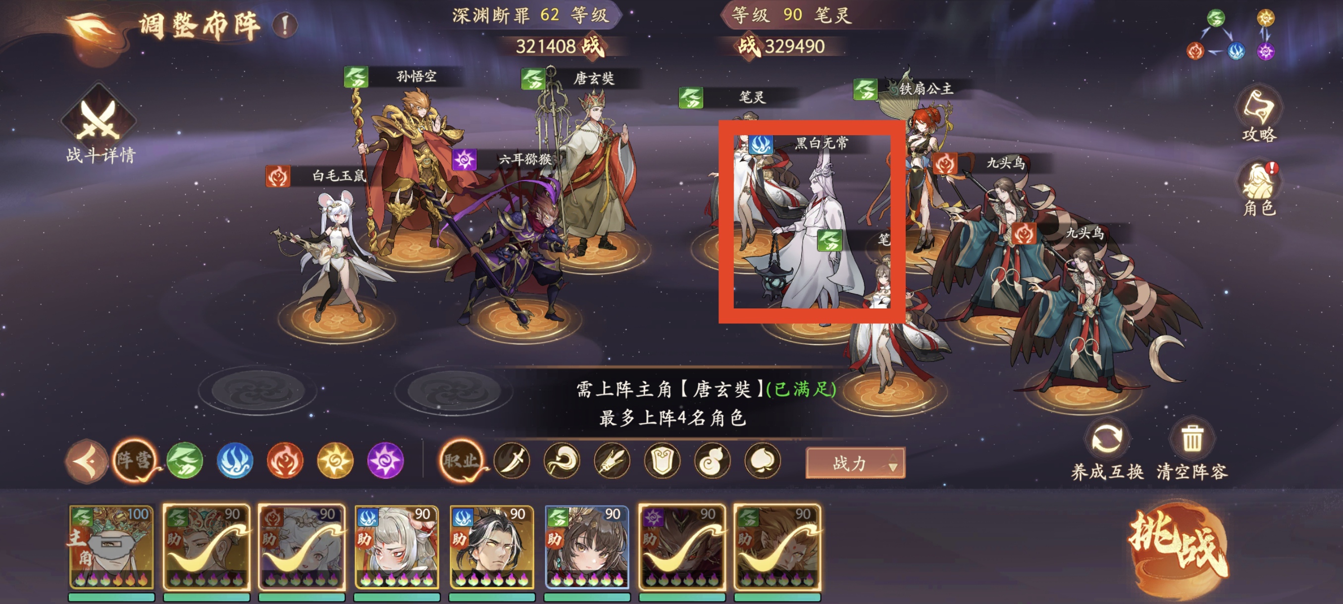 同样上阵3输出,黑猴因为有隐身有锁血,所以跟唐僧一起站在前排当肉盾。