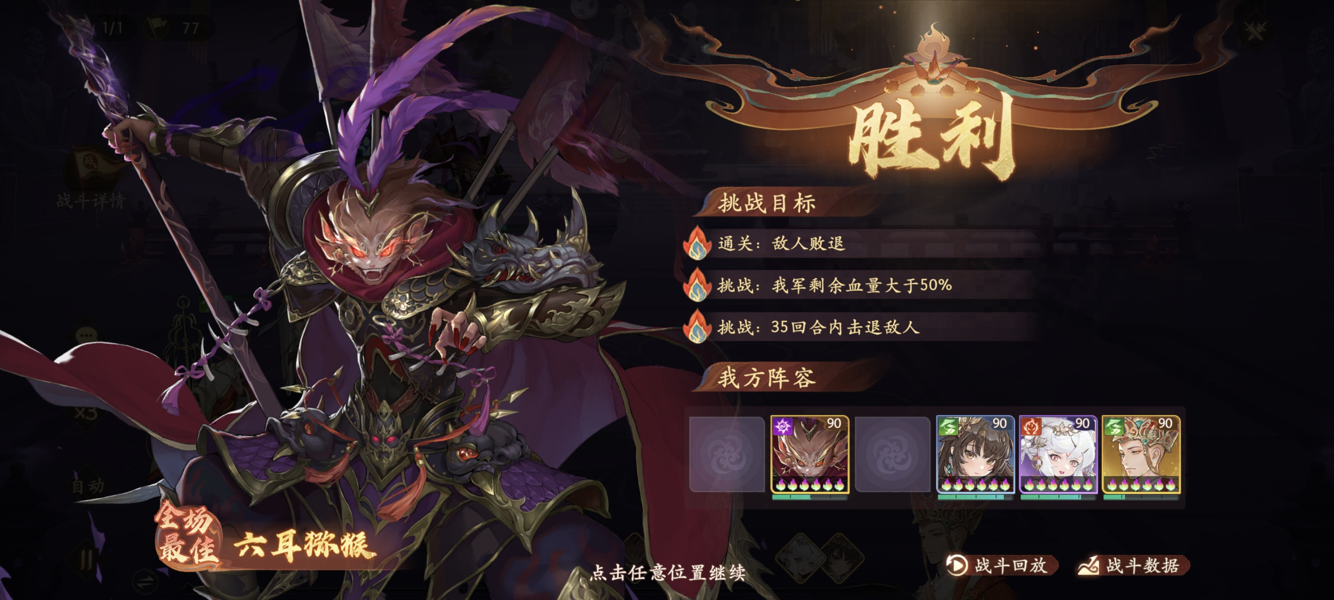 作为最终关卡难度还是非常高的,首先必须要凹黑猴大招能触发追击,直接打出黑熊精的复活,然后用老鼠精大招+其他人的普攻打死黑熊精。