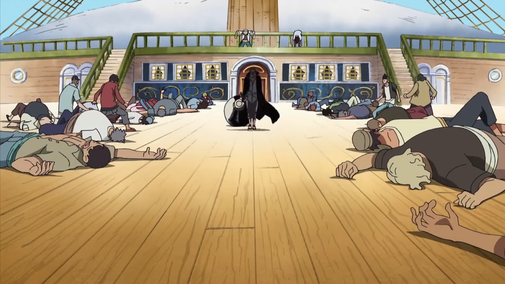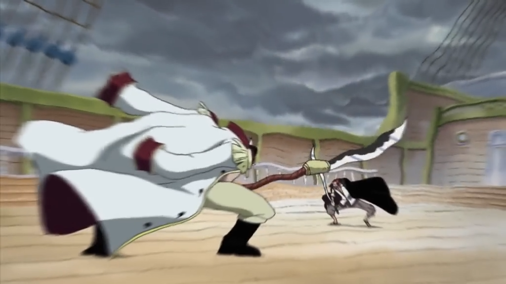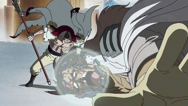 香克斯缓慢地朝前踏步,并对周围释放霸王色霸气,对敌人造成短暂的晕眩效果。