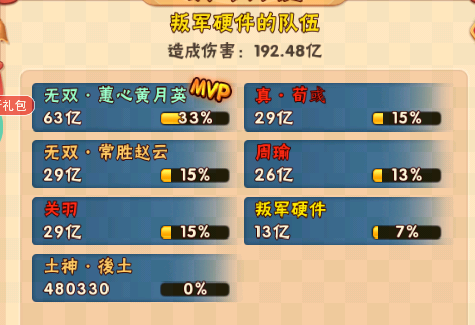 为叛军尽快毕业考虑,优先考虑黄月英,其他武将攻击时额外附加当前黄月英龙魂值*黄月英攻击的直接伤害,保证光环武将在叛军中有伤害,不需要其他硬件情况下,单黄月英可以200w攻击稳定毕业