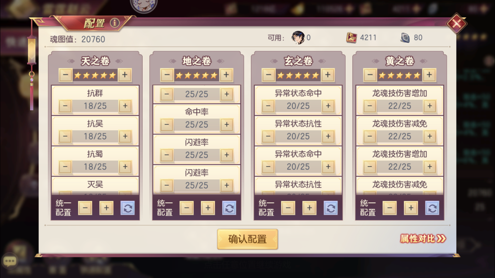 龙纹石养成:龙魂未全满15000均点,在全满15000的情况下,偏门点,优先级为地卷>黄之卷>玄之卷>天之卷,即优先级高的等级可以高一些,但是也不需要极限,比如楼主地卷均24姬,黄卷23级,玄卷20级,天卷18级,这样可以获得更高的战力。(由于现在的先手优势比较大,因此这样点龙纹石)