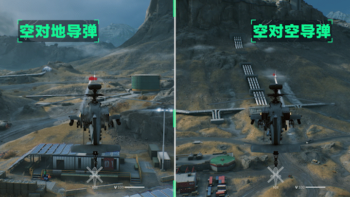 副武器则有【空对地导弹】以及【空对空导弹】两种选择,这两种分别是针对地面载具和针对空中载具的制导武器,都需要一定时间窗口锁定目标后才可发射。